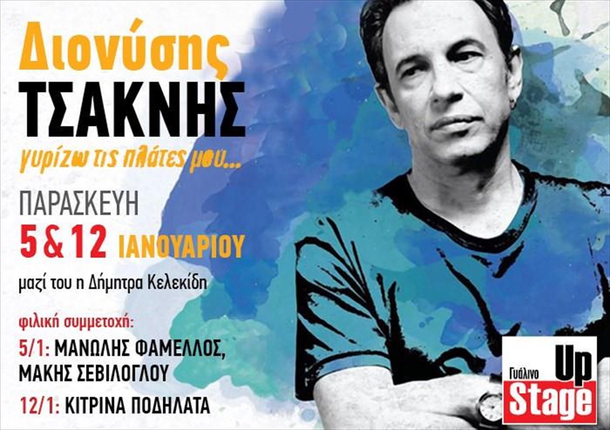 Μετά από ένα μικρό διάστημα αποχής από τα μουσικά δρώμενα, ο Διονύσης Τσακνής ξεκινά τις χειμωνιάτικες εμφανίσεις του. Για τις Παρασκευές, 5 & 12 Ιανουαρίου 2018, o αγαπημένος συνθέτης και τραγουδοποιός θα παρουσιάσει στο Γυάλινο Up Stage ένα πρόγραμμα γεμάτο με όλες τις μεγάλες και διαχρονικές επιτυχίες του, αλλά και με τραγούδια φίλων του που έχουν γράψει τη δική τους ιστορία στην ελληνική μουσική. Μαζί με τον Διονύση Τσακνή εμφανίζεται η νέα και πολλά υποσχόμενη τραγουδίστρια Δήμητρα Κελεκίδη, που συστήθηκε στο ευρύ κοινό, κλέβοντας τις εντυπώσεις, μέσα από τις τηλεοπτικές εμφανίσεις της σε γνωστό talent show. Στη συντροφιά τους θα βρεθούν και αγαπημένοι φίλοι: Την Παρασκευή 5 Ιανουαρίου, ο Μανώλης Φάμελλος και o Μάκης Σεβίλογλου και στις 12 Ιανουαρίου, τα Κίτρινα Ποδήλατα. Τον Διονύση Τσακνή και τη Δήμητρα Κελεκίδη, πλαισιώνει μία ομάδα εξαιρετικών μουσικών. Ο Νίκος Καλαντζάκος στο πιάνο, ο Δημήτρης Καρασούλος στην κιθάρα, ο Ηλίας Παρασκευόπουλος στα τύμπανα και ο Νίκος Πολίτης στο μπάσο.