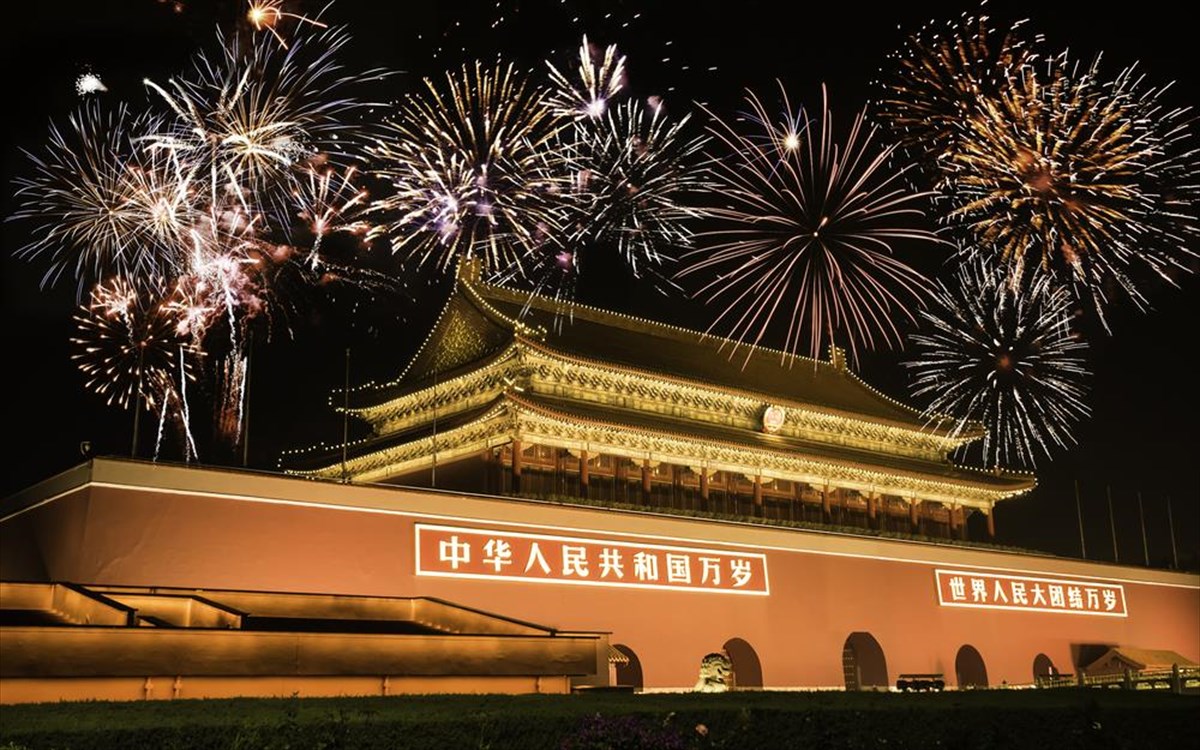 Το φωτισμένο Πεκίνο στην Πύλη της Ουράνιας Ειρήνης μόλις μπαίνει το νέο έτος.