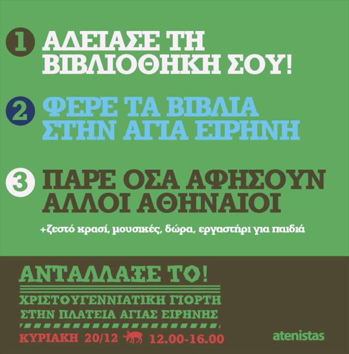 Η μεγαλύτερη ανταλλαγή βιβλίων στην πόλη για 6η χρονιά και αυτά τα Χριστούγεννα στην Αγία Ειρήνη. Από τις 12:00 ως τις 16:00 φέρνουμε βιβλία, cds και dvd που είναι σε καλή κατάσταση αλλά δεν χρειαζόμαστε ή θέλουμε να δωρίσουμε, τα αφήνουμε στους πάγκους και παίρνουμε άλλα που μπορεί να μας ενδιαφέρουν. Αδειάστε τις βιβλιοθήκες σας, δώστε ζωή σε βιβλία που δεν χρειάζεστε πια.