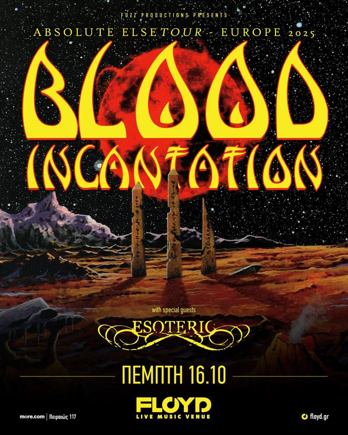 Έτσι λοιπόν, όλοι οι δρόμοι, όχι μόνο για τους ακροατές του σκληρού ήχου αλλά και για όλους αυτούς που αναζητούν να εξερευνήσουν τα όρια της μουσικής, οδηγούν στο Floyd της οδού Πειραιώς 117, την Πέμπτη 16 Οκτωβρίου, όπου οι Blood Incantation συνεχίζουν την προώθηση του πιο πρόσφατου τους album "Absolute Elsewhere", το οποίο κυκλοφόρησε πέρυσι, τέτοιο καιρό. Support act θα είναι οι Βρετανοί Esoteric, μπάντα που κινείται σε μια πιο αργή έκδοση του Death Metal.