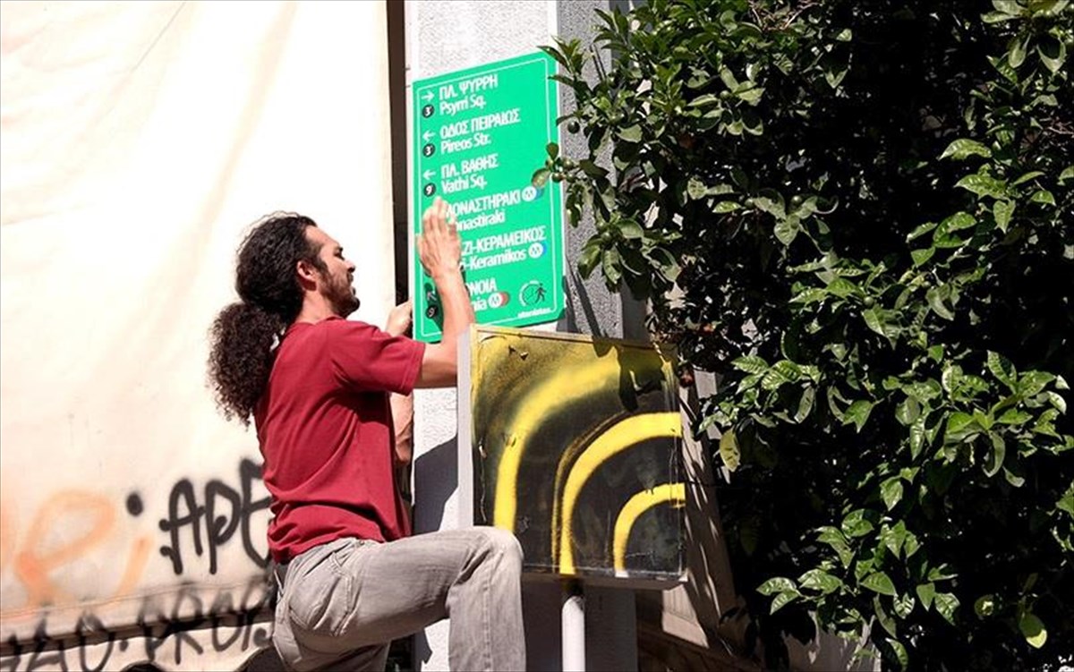 Οι Atenistas επιλέγουν κομβικά σημεία της πόλης και με τη χρήση σηματοδοτών αναδεικνύουν το κέντρο και διευκολύνουν τον περαστικό.