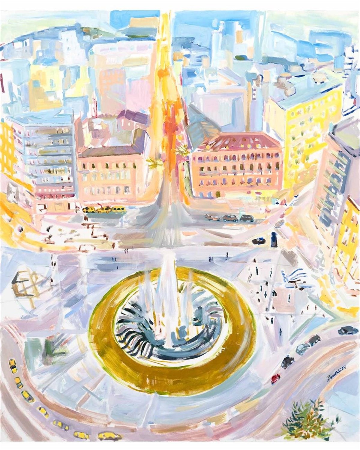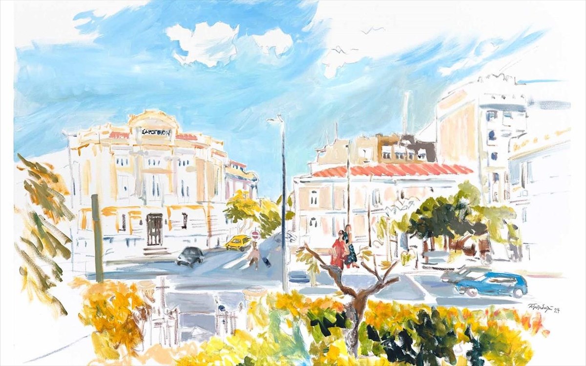 Στον αντίποδα της μελαγχολικής διάθεσης που διαπνέει τα έργα αυτά, η επόμενη ενότητα αποτυπώνει μία παλλόμενη, γεμάτη ζωντάνια ατμόσφαιρα με τα λαμπερά, σχεδόν fauve χρώματα που συνυπάρχουν σε εκρηκτικούς συνδυασμούς. Το βλέμμα της ζωγράφου αγκαλιάζει με τρυφερότητα αγαπημένα σε όλους μας σημεία στην πόλη, από το Μουσείο Κυκλαδικής Τέχνης στη Βασιλίσσης Σοφίας μέχρι στέκια για καφέ και ποτό στα Εξάρχεια και το Παγκράτι. Ανθρώπινες μορφές ενοικούν τα έργα αυτά, σε στιγμές χαλαρής κοινωνικότητας, συνομιλώντας, χαζεύοντας τις βιτρίνες ή αφήνοντας το βλέμμα να περιπλανηθεί σε μία πανοραμική άποψη της Πλατείας Ομονοίας από ψηλά.