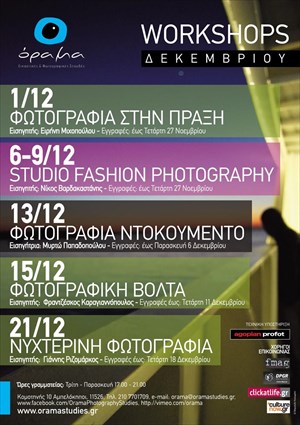 Πληροφορίες: Σχολή εικαστικών και φωτογραφικών σπουδών «Όραμα», Κομοτηνής 10 Αμπελόκηποι, 11526, τηλ. 2107701709, www.oramastudies.gr , www.facebook.com/OramaPhotographyStudies , [email protected], ώρες γραμματείας: Τετάρτη, Πέμπτη, Παρασκευή 17.00 - 21.00.