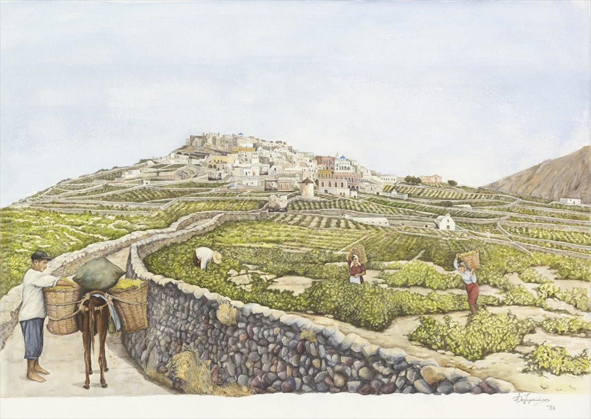 Με 15 έργα (όλα υδατογραφίες), η Άρτεμις Χατζηγιαννάκη ορίζει έναν τρόπο θέασης στον ορίζοντα της Σαντορίνης μέσα από τους τελετουργικούς κύκλους της παράδοσης, των κύκλων εργασίας, της τοπικής οικονομίας, των εθίμων και του συλλογικού θυμικού. Ο επισκέπτης θα αναγνωρίσει πτυχές μιας Σαντορίνης που επιβιώνει όχι μόνο στη μνήμη και στην προφορική μαρτυρία, αλλά και στο ανάγλυφο του τοπίου, στην αρχαία γη, στην γραμμή του ορίζοντα, στην παράδοση του οίνου και της αμπέλου, στα γεωργικά προϊόντα, στη χλωρίδα και στους κύκλους του χρόνου, στην αρχιτεκτονική, που διατρέχει τη στερεότυπη εικόνα της Σαντορίνης μέσα από εκλάμψεις αυθεντικότητας και αρχέγονης σοφίας.