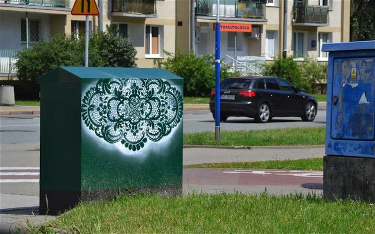 Η NeSpoon αφήνει το δικό της εικαστικό στίγμα με μοτίβα δαντέλας σε δρόμους, φανάρια, τοίχους, πόρτες, παρκόμετρα και σε άλλα αστικά σημεία.