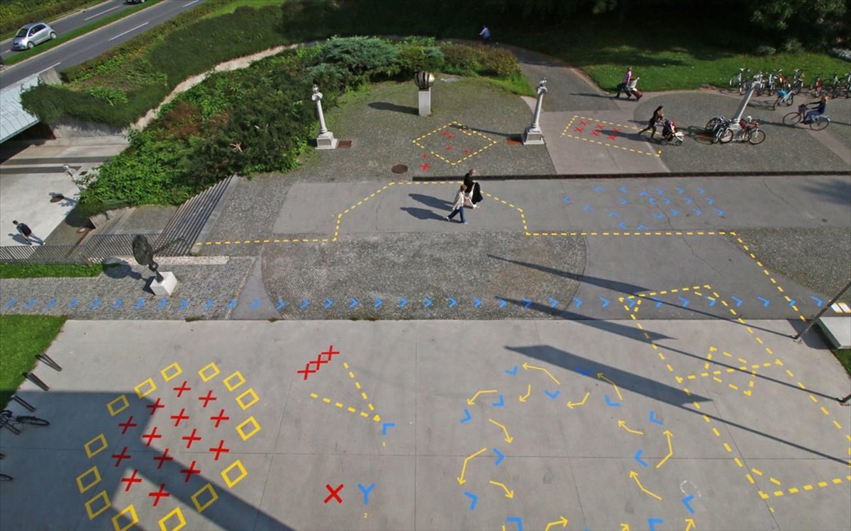 Ο νόμος, σιωπηρά πανταχού παρών σε κάθε δημόσιο χώρο, τείνει να είναι αλγοριθμικός, ποσοτικός και αόρατος. Οι τοπικές και εθνικές κανονιστικές διατάξεις επιμερίζουν την ανθρώπινη συμπεριφορά σε διακεκριμένα τμήματα• άλλοτε είναι αυστηρές και μαθηματικές και άλλοτε πάλι χαλαρές και ελλιπώς καθορισμένες. Εδώ, παραχωρούνται για να αναπαρασταθούν οπτικά, μέσα από σκηνοθετημένες χορογραφίες. Το Friction Atlas (Άτλαντας Τριβών) είναι ένα κριτικό εν εξελίξει αρχείο, όπου συλλέγονται και αναπαριστώνται νόμοι που ρυθμίζουν τις συμπεριφορές και τις συναθροίσεις σε δημόσιους χώρους, με δείγματα που έχουν ληφθεί από διαφορετικά πλαίσια. Το αρχείο αυτό αποσκοπεί να καταστήσει σαφείς τους νόμους αυτούς, μέσω γραφιστικών μηχανισμών. Με το σχεδιασμό διαγραμμάτων κλίμακας 1:1, που αναπαριστούν τους νόμους σε δημόσιες επιφάνειες, το πρότζεκτ προκαλεί ένα δημόσιο διάλογο για τις νομικές υποχρεώσεις και τα νομικά κενά. Μέσω της ενεργούς ανάμειξης του κοινού, η δυναμική της εξουσίας γίνεται επίσης διακριτή. Τα διαγράμματα αναπαριστούν περιπτώσεις κανονιστικών διατάξεων από διάφορες πόλεις, μεταξύ άλλων από την Αθήνα, τη Γένοβα, το Κάιρο, την Ουάσιγκτον, τη Στοκχόλμη, το Σύδνεϋ, τη Νέα Υόρκη και τη Ρώμη. Καλούμε το κοινό να συμμετάσχει σε ένα χορογραφημένο δημόσιο διάλογο, σε μια εκ νέου ανάγνωση του αστικού χώρου, που θα φωτίσει ορισμένες από τις κρυφές πλευρές του.