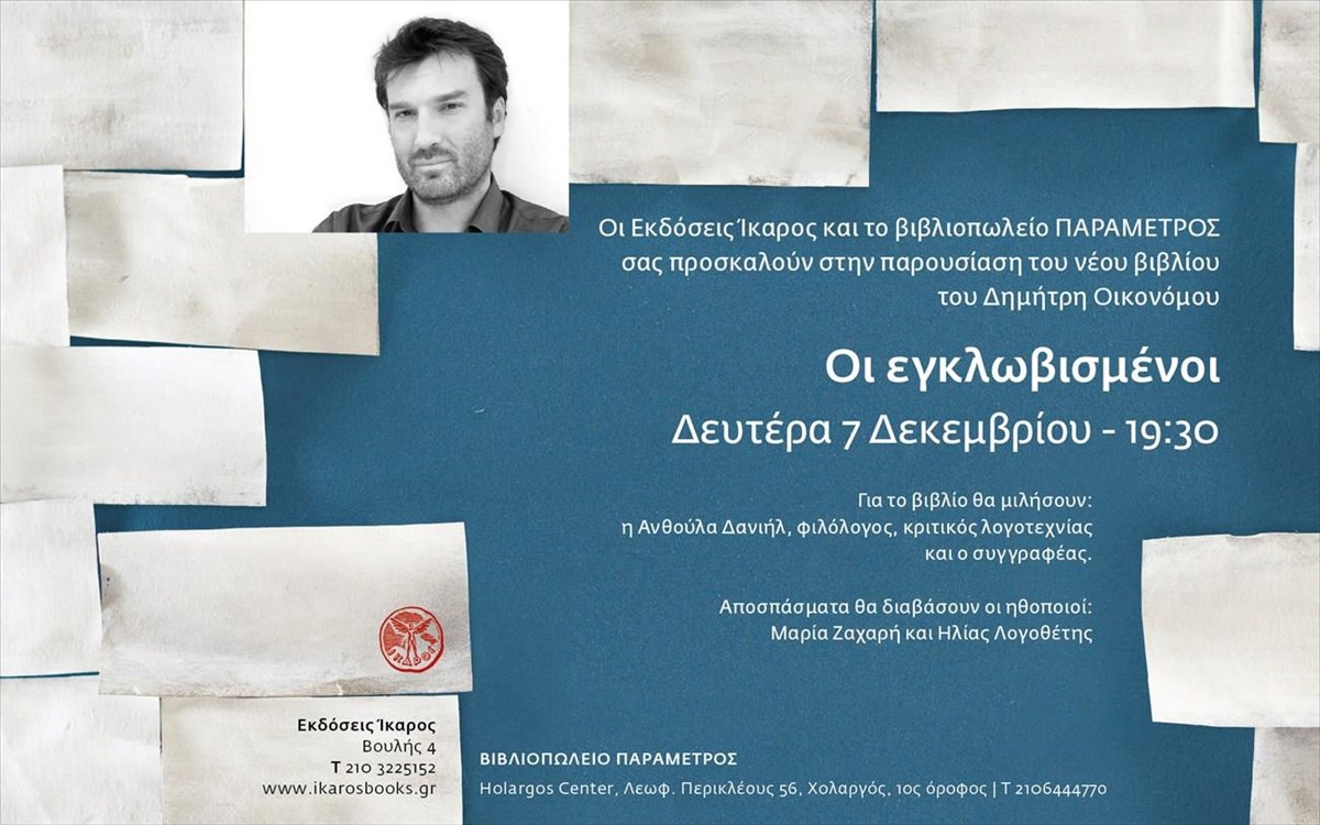 Το νέο βιβλίο του Δημήτρη Οικονόμου "Οι Εγκλωβισμένοι" παρουσιάζεται σήμερα στον Χολαργό, Δευτέρα 7 Δεκεμβρίου, στις 19:30, στο βιβλιοπωλείο Παράμετρος.