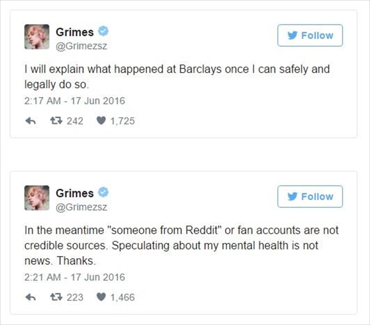 «Μας συνέβη κάτι πραγματικά ενοχλητικό σήμερα, συγγνώμη αν η φωνή μου τρέμει», είχε δηλώσει η Grimes λίγο πριν το περιστατικό.