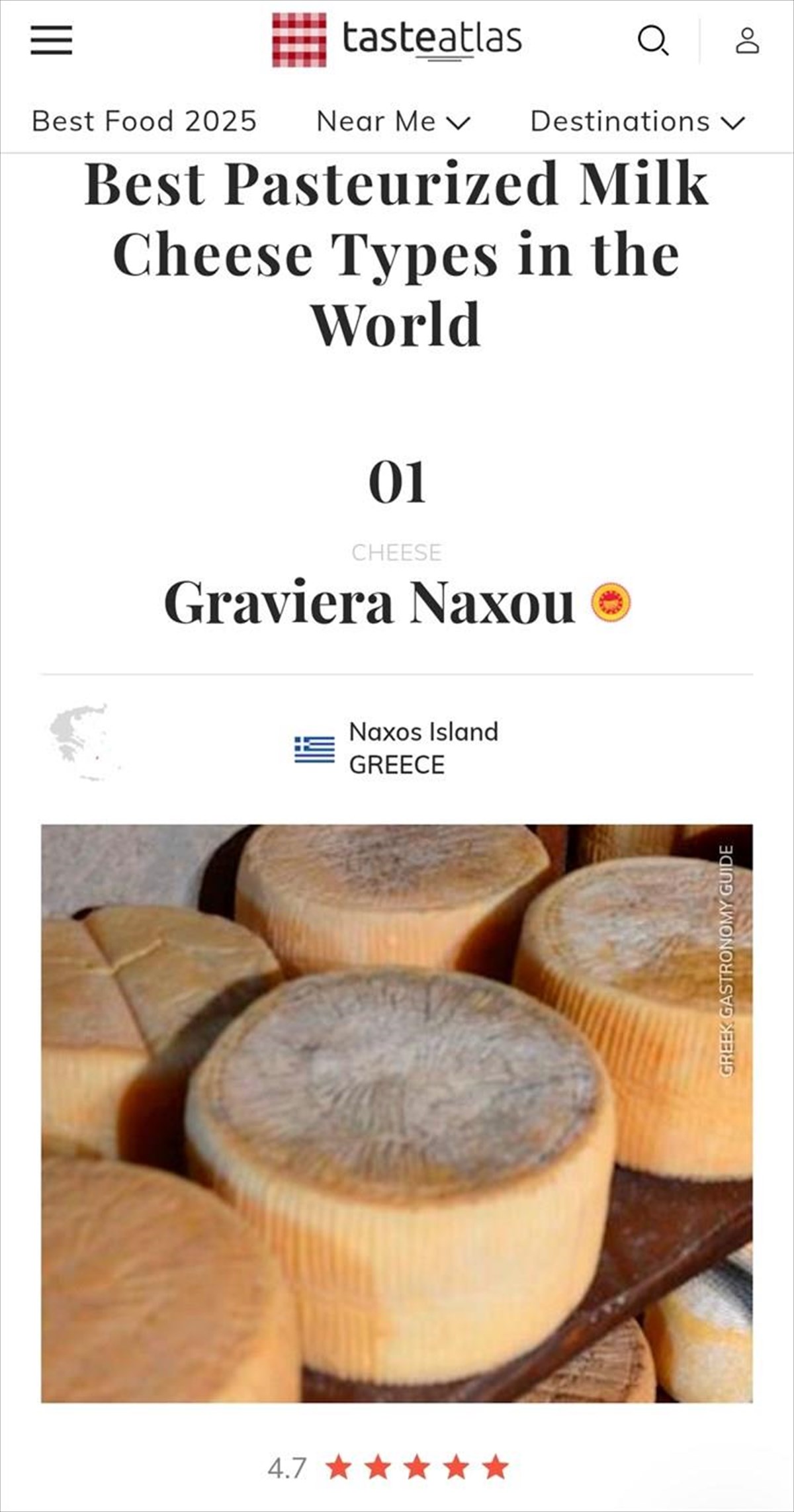 Μπορεί η Γαλλία και η Ελβετία να φημίζονται για τα τυριά τους, τα ελληνικά τυριά, ωστόσο, κατέκτησαν σχεδόν ολοκληρωτικά την κορυφαία 10άδα του Taste Atlas με τα καλύτερα παστεριωμένα τυριά στον κόσμο. Στην κορυφή βρέθηκε η Γραβιέρα Νάξου με βαθμολογία 4.7/5, κερδίζοντας τις εντυπώσεις, με τα προϊόντα του τυροκομείου Πιτταρά, αλλά και της Ένωσης Αγροτικών Συνεταιρισμών να ξεχωρίζουν.