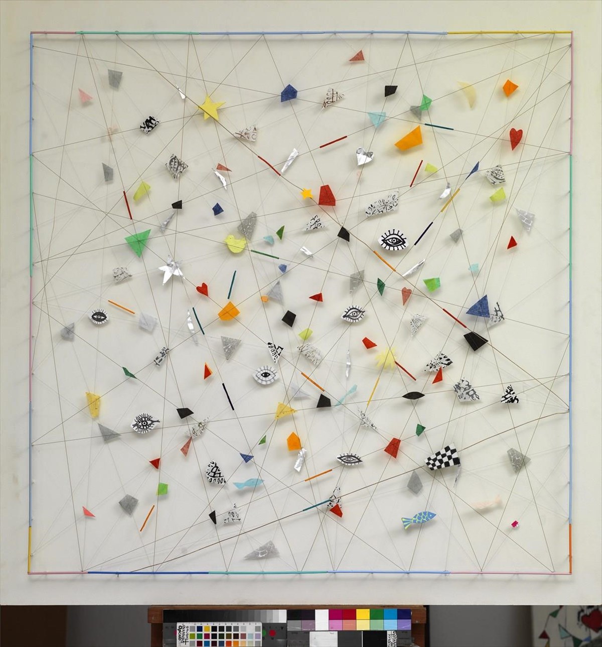 Η τρίτη ατομική έκθεση της Στέλλας Μελετοπούλου προτείνει μια σειρά από απέριττες «υφάνσεις» τόπων και διαδρομές σκέψεων επάνω σε μονοχρωματικούς κάμπους όπου οι ενθέσεις αντικειμένων άλλοτε ορίζονται σχεδιαστικά και άλλοτε προστίθενται κυριολεκτικά, οριοθετούμενες από συρμάτινα, πλαστικά ή υφασμάτινα νήματα. Το αρθρωτό πλαστικό σώμα των μεκανό, οι γεωμετρικές φόρμες (τρίγωνο, τετράγωνο, κύκλος ή ημικύκλιο), οι οργανικές έμβιες εικόνες και οι χρήσεις συμβόλων όπως το ψάρι ή το μάτι-φανός, αιωρούμενες εντός των αυστηρών ορίων που θέτει η ζωγράφος, πάλλονται ανάμεσα στα νήματα που η ίδια χρησιμοποιεί σαν χορδές μουσικού οργάνου, ή καρφιτσώνονται σαν πολύτιμες υπαινικτικές σημάνσεις επάνω σε αφαιρετικές μονοχρωματικές επιφάνειες από ξύλο ή καμβά.