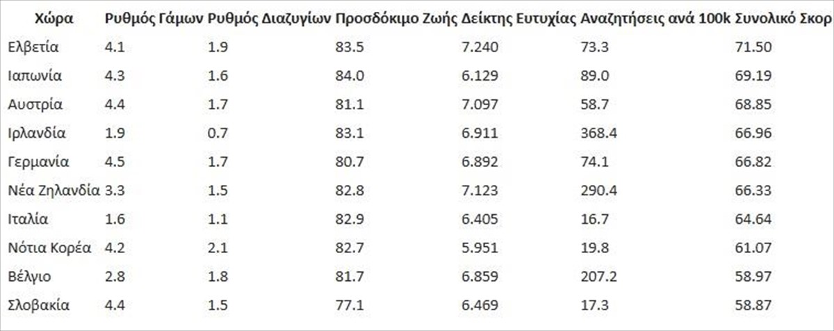 Η Ελβετία ηγείται της κατάταξης με συνολικό σκορ 71.50, διαπρέποντας όσον αφορά το προσδόκιμο ζωής και τους δείκτες ευτυχίας. Κοντά της βρίσκονται η Ιαπωνία και η Αυστρία, οι οποίες παρουσιάζουν ισχυρούς δείκτες ευτυχίας στα ζευγάρια.