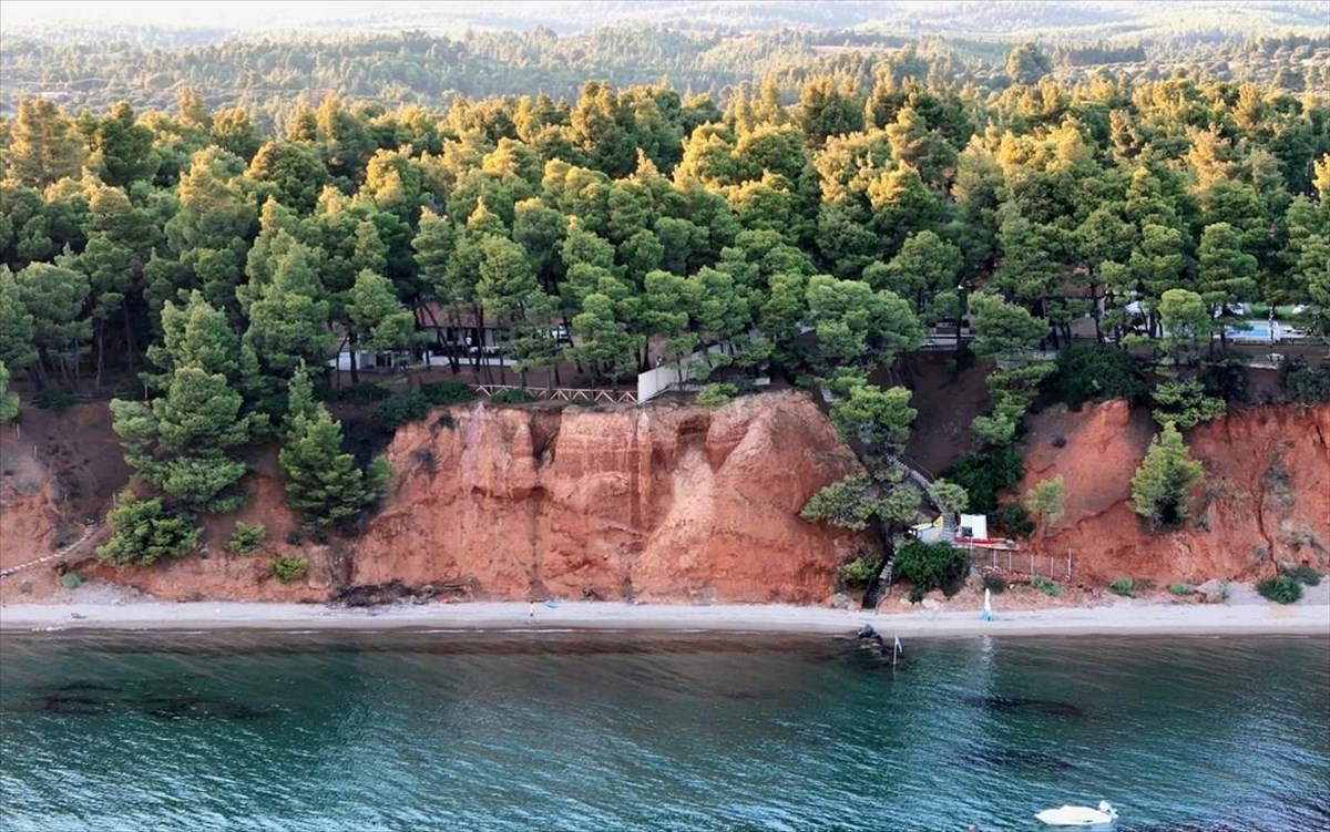 Βρίσκεται στον δρόμο από τη Μεταμόρφωση προς τη Νικήτη, λίγο έξω από τον κεντρικό δρόμο, και ξεχωρίζει για τον μοναδικό συνδυασμό πράσινου, κόκκινου και τιρκουάζ: τα καταπράσινα πεύκα κατεβαίνουν σχεδόν μέχρι την άμμο, προσφέροντας δροσιά και φυσική σκιά ακόμη και τις πιο ζεστές μέρες, ενώ οι κόκκινοι βράχοι δημιουργούν ένα εντυπωσιακό φόντο που δίνει χρώμα και χαρακτήρα στην παραλία.