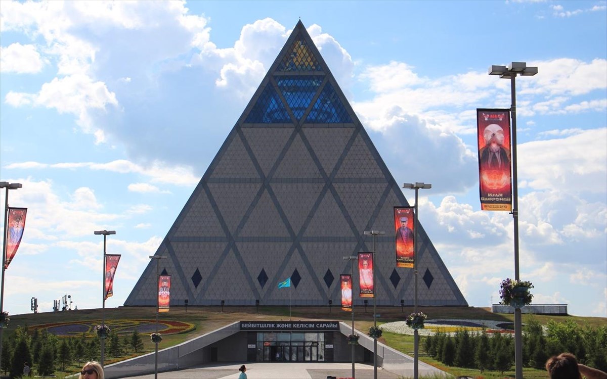 Στην άλλη άκρη του κέντρου βρίσκεται το Παλάτι για την Ειρήνη και την Αρμονία, μία τεράστια πυραμίδα που έχει χτιστεί πάνω σε έναν τεχνητό λόφο σε σχέδια του Φόστερ και κόστισε 200 εκατ. δολάρια. Η ανέγερσή της ξεκίνησε από μια ιδέα του Προέδρου της χώρας Νουρσουλτάν Ναζαρμπάεφ, ο οποίος θέλησε να κατασκευάσει ένα κέντρο συνάντησης των θρησκευτικών ηγετών της υφηλίου. Η πυραμίδα έχει ύψος 60 μέτρα και στο πρώτο επίπεδο στεγάζει μια αίθουσα συναυλιών 1.500 θέσεων. Δύο ακόμα όροφοι φιλοξενούν παρεκκλήσια για τις δεκαοκτώ βασικές θρησκείες της χώρας, που συνολικά ξεπερνούν τις σαράντα. Φτάνοντας στην οροφή, αφού περάσαμε από έναν αιωρούμενο διάδρομο που περιβάλλεται από έναν κρεμαστό κήπο μπήκαμε σε μια αίθουσα όπου οι θρησκευτικοί ηγέτες του κόσμου συναντώνται κάθε τρία χρόνια. Στους γυάλινους τοίχους της αίθουσας κυριαρχούν βιτρό που έχουν μοτίβα ιπτάμενων περιστεριών, ένα θέαμα που φυσικά δεν μας άφησε ασυγκίνητους.