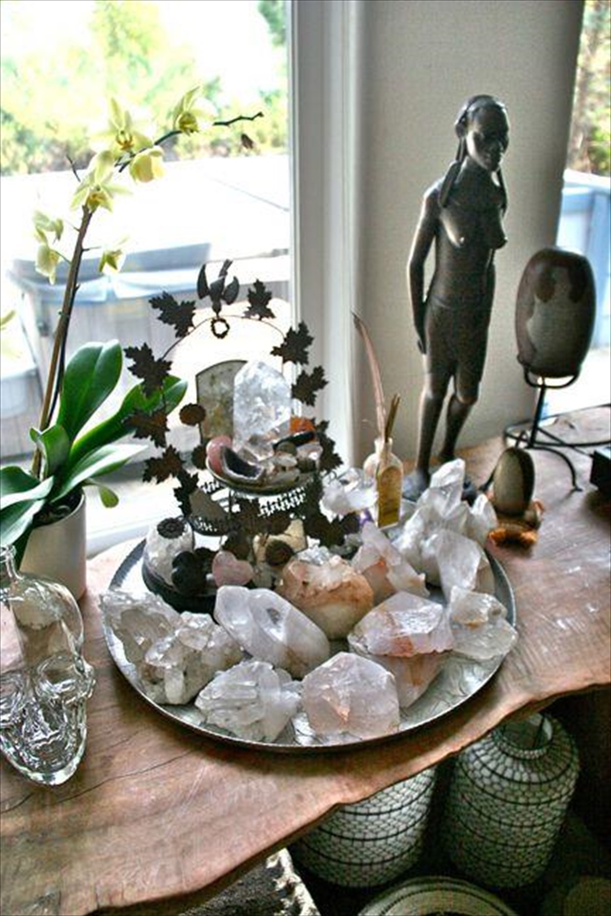 Στο σαλόνι βάζουμε μεγάλους, διαφανείς κρυστάλλους. Στα υπνοδωμάτια, προσθέτουμε ροζ χαλαζία ή αμέθυστο στο κομοδίνο. Για αγάπη, ηρεμία, γλυκά όνειρα. Ο αμέθυστος μας κρατάει σε τέλεια διάθεση, μπορούμε να τον χρησιμοποιούμε σε όλους τους χώρους του σπιτιού. Νεφρίτη ή ζαντ στο μπάνιο, ακόμη και στη μπανιέρα, για υγεία και ομορφιά.