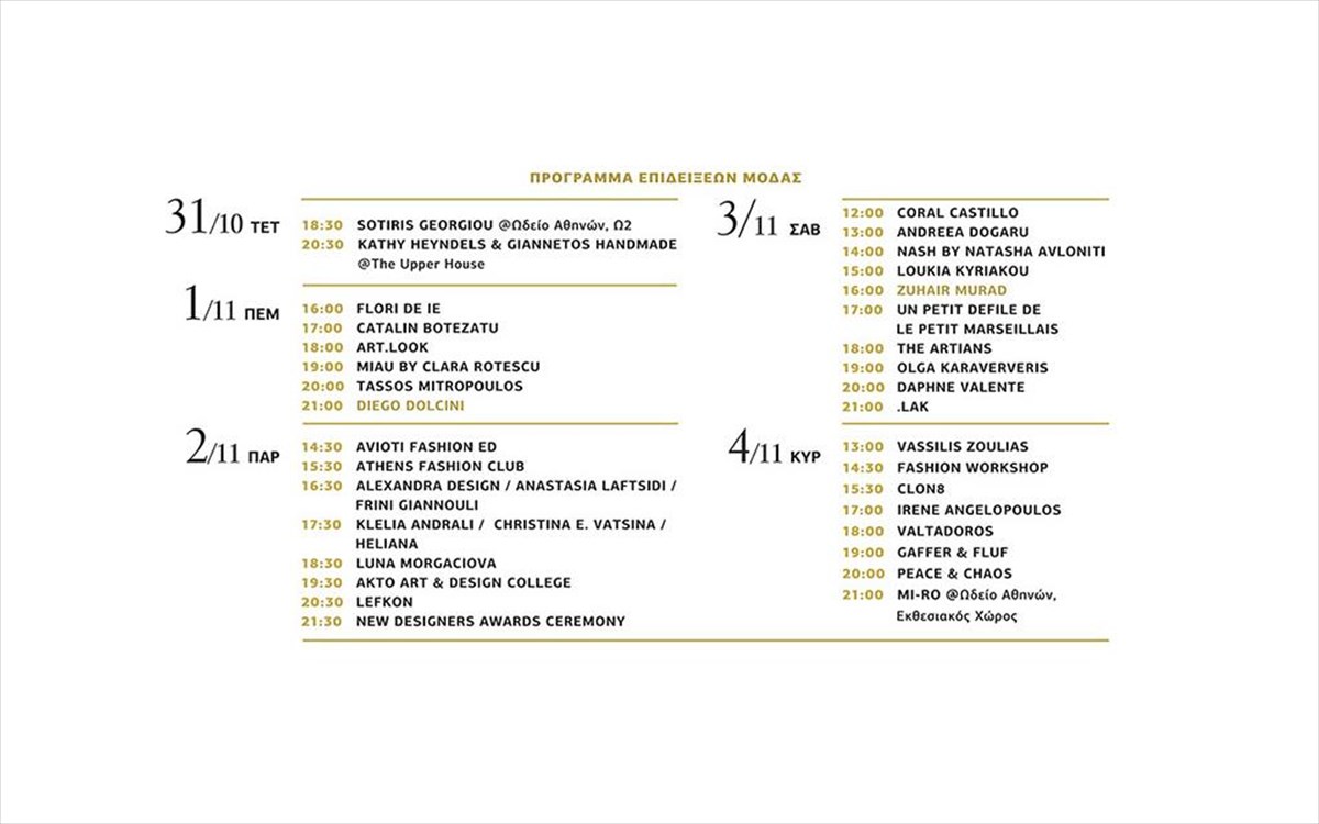 Τι ξεχωρίζουμε; Την επίδειξη του Σωτήρη Γεωργίου στο Ωδείο Αθηνών, το σόου του Diego Dolcini με ψηλοτάκουνα-κρύσταλλα Baccarat, το ντεφιλέ του Zuhair Murad, την επιστροφή της Δάφνης Βαλέντε, το installation-έκπληξη του Λάκη Γαβαλά με την .LAK, την παράσταση με αρχή, μέση και τέλος του Βασίλη Ζούλια και όπως πάντα, το καθιερωμένο κλείσιμο της εβδομάδας με Mi-Ro και αφιέρωμα στο κόκκινο χρώμα, στο Ωδείο Αθηνών.
