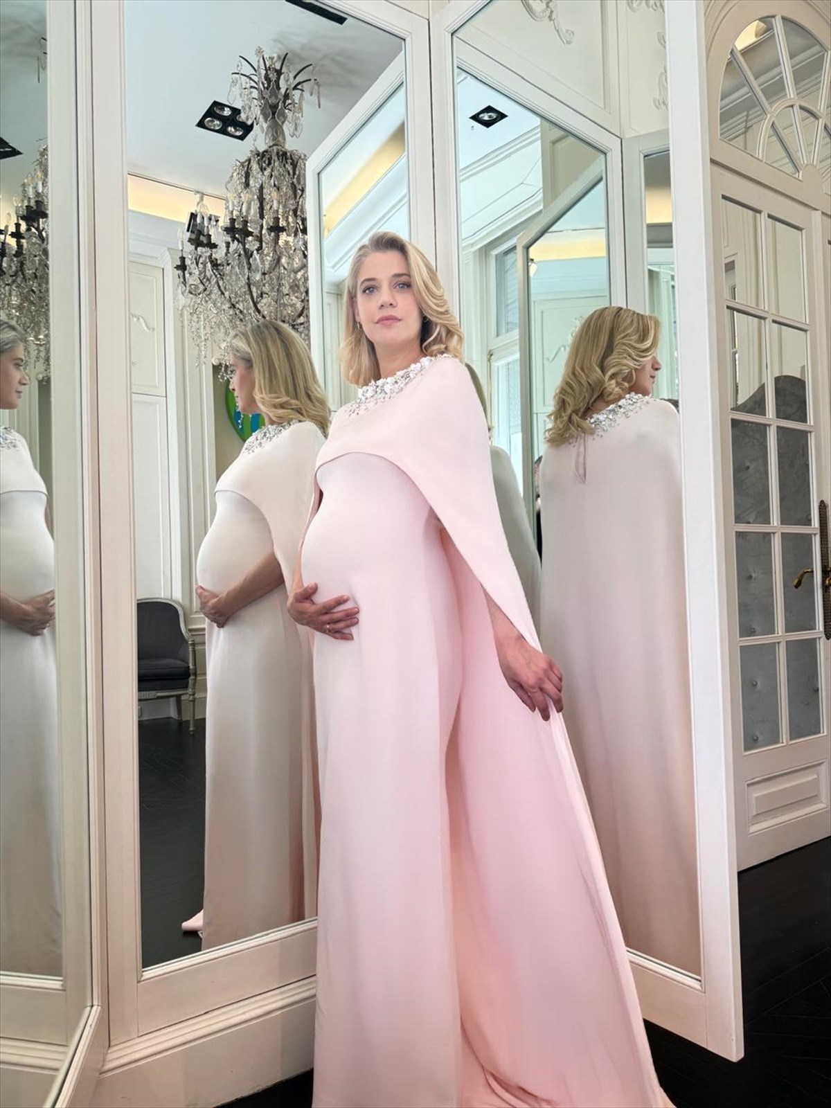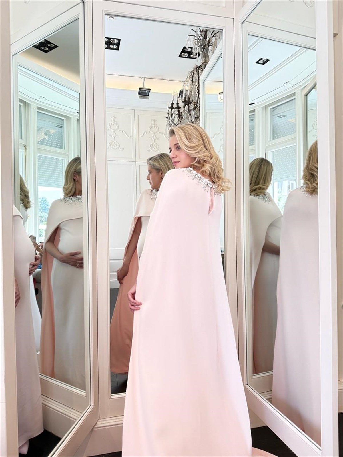 Η Τζένη Θεωνά, η οποία διανύει τον πέμπτο μήνα της εγκυμοσύνης της, επέλεξε μια ξεχωριστή δημιουργία του ιστορικού Οίκου Celia Kritharioti. Πρόκειται για ένα απαλό ροζ φόρεμα σε συνδυασμό με μια εντυπωσιακή, χειροποίητη κεντημένη κάπα, διακοσμημένη με λουλούδια και λαμπερά κρύσταλλα. Ένα look που απέπνεε ρομαντισμό, κομψότητα και συμβολισμό, αναδεικνύοντας τη σύγχρονη γυναικεία θηλυκότητα μέσα από την τέχνη της υψηλής ραπτικής.