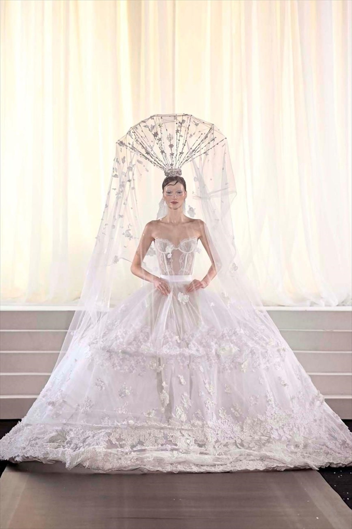Photo: Filippo Fior / Gorunway.comΗ κινηματογραφική αίγλη βρίσκεται στην καρδιά αυτής της συλλογής, θεμελιωμένη στο παραδοσιακό couture savoir-faire. Από το ατελιέ του Οίκου στην Αθήνα μέχρι το Παρίσι και το Χόλιγουντ, τα φτερά, η λάμψη και η φαντασία μεταφράζονται σε μια σύγχρονη γλώσσα απόλυτης φινέτσας. Μαύρες βελούδινες κουρτίνες πλαισιώνουν την αίθουσα Pavillon Cambon, ενώ το catwalk είναι τυλιγμένο με ατελείωτα μέτρα λευκού σιφόν, δημιουργώντας ένα μοναδικό θέαμα. Τα μοντέλα κατεβαίνουν τα σκαλιά, φέροντας τον μεθυστικό αέρα του Old Hollywood στην καρδιά του Παρισιού.