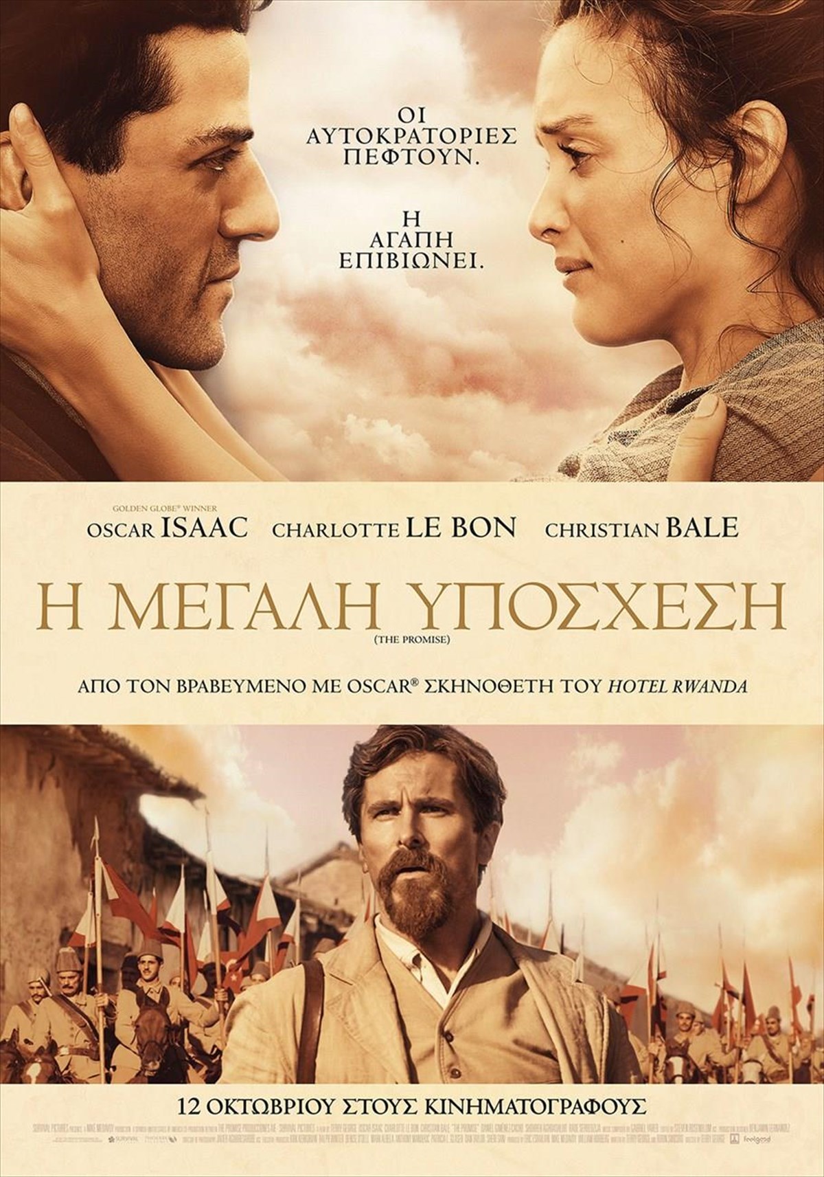 Με επίκεντρο το επίμαχο θέμα της γενοκτονίας των Αρμενίων, «Η Μεγάλη Υπόσχεση» διηγείται μια επική ερωτική ιστορία που θέλει τους ταλαντούχους Christian Bale (American Psycho, The Dark Knight) και Oscar Isaac (Star Wars: The Force Awakens, Ex Machina) να διεκδικούν την καρδιά της γοητευτικής Charlotte le Bon (The Walk), ενώ η μοίρα τους φέρνει κοντά εξαιτίας των κοσμοϊστορικών γεγονότων που έλαβαν χώρα στην Οθωμανική Αυτοκρατορία το 1914. Πλέκοντας αριστοτεχνικά το προσωπικό με το ιστορικό, ο σκηνοθέτης «στήνει» μια υπερπαραγωγή με φόντο μια χώρα σε αναβρασμό και με ήρωες που γίνονται αναπάντεχα μάρτυρες σε μια από τις μεγαλύτερες τραγωδίες του 20ου αιώνα.