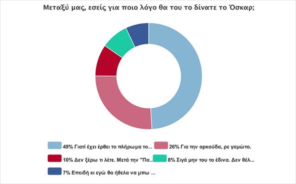 Η άποψη ότι ενδεχομένως το πολυπόθητο βραβείο να το έλαβε, όχι γιατί πραγματικά το άξιζει για την συγκεκριμένη ταινία, αλλά γιατί επιτέλους κάποτε έπρεπε να το πάρει, εξακολουθεί να αποτελεί θέμα συζήτησης στα πηγαδάκια των σινεφίλ και μάλλον αποτυπώθηκε και στις απαντήσεις του δικού μας poll. Στην ερώτηση λοιπόν για ποιο λόγο θα δίνατε στον Ντι Κάπριο το Όσκαρ, το 49% απάντησε πως θα το έκανε γιατί έχει έρθει το πλήρωμα του χρόνου. Μάλλον όλοι είμαστε σύμφωνοι σε αυτό...