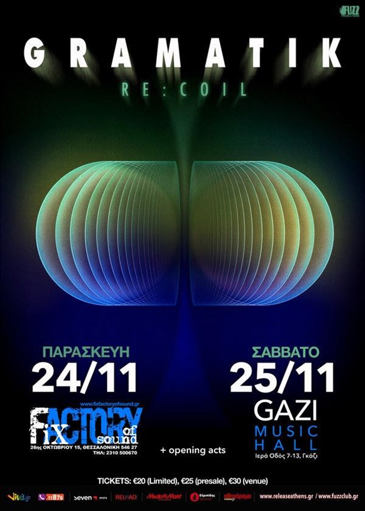 Παρασκευή 24 Νοεμβρίου, Fix Factory of Sound (26ης Οκτωβρίου 15, Θεσσαλονίκη / τηλ. 2310 500670 & 2310 504014/www.fixfactoryofsound.gr) και Σάββατο 25 Νοεμβρίου, Gazi Music Hall.