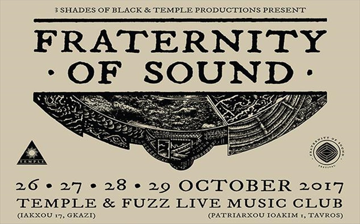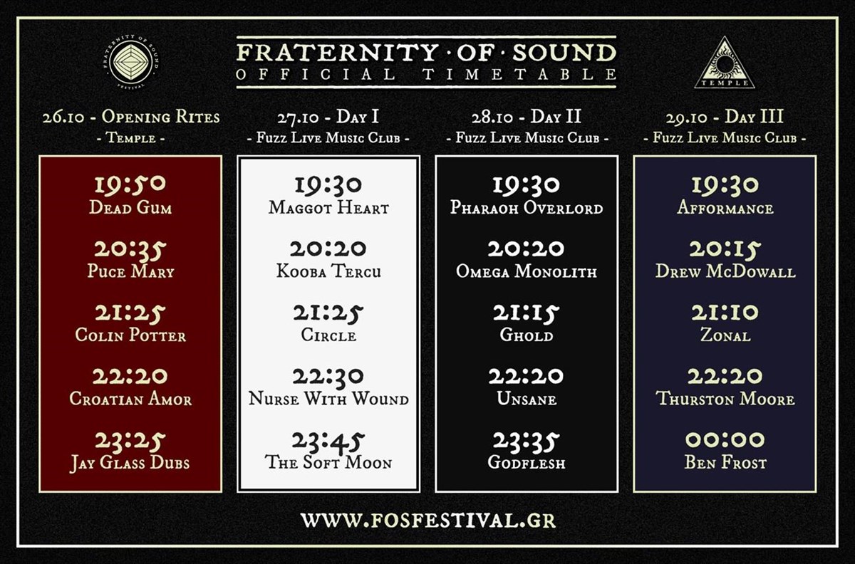 Δείτε το πλήρες πρόγραμμα του τετραημέρου Fraternity of Sound Festival, που από τις 26 έως τις 29 Οκτωβρίου θα μας φέρει σε επαφή με μερικά εκ των σημαντικοτέρων ονομάτων του παγκόσμιου underground μουσικού στερεώματος.