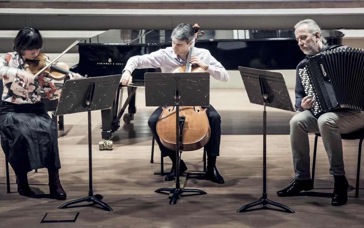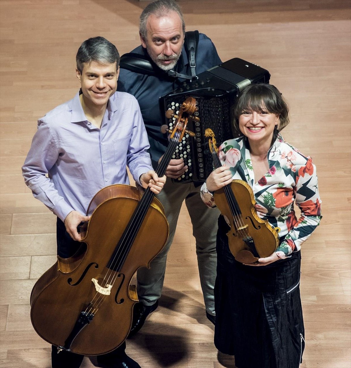 © Τάσος ΘώμογλουΤο Trio Grasp εν ώρα πρόβας. Από αριστερά: Γκρέτα Παπά (βιολί), Βασίλης Σαΐτης (τσέλο), Κωνσταντίνος Ράπτης (μπαγιάν).