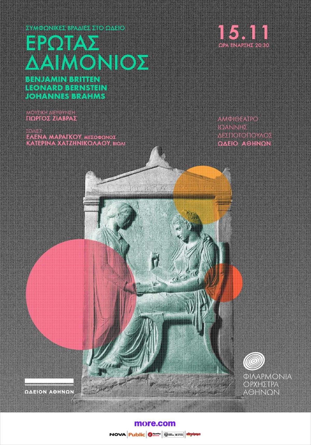 Για την Τετάρτη, 15 Νοεμβρίου, ο διαπρεπής νέος Έλληνας μαέστρος, με σπουδαία σταδιοδρομία στο Εξωτερικό, Γιώργος Ζιάβρας, επέλεξε να στρέψει το βλέμμα στην καινοτόμα μουσική του Εικοστού αιώνα: του αιώνα της πρωτοπορίας και των μεγάλων ανατροπών. Τα δύο έργα του προγράμματος προέρχονται από τη γραφίδα σπουδαίων συνθετών και είναι εμπνευσμένα από την αρχαιοελληνική γραμματεία και φιλοσοφία.