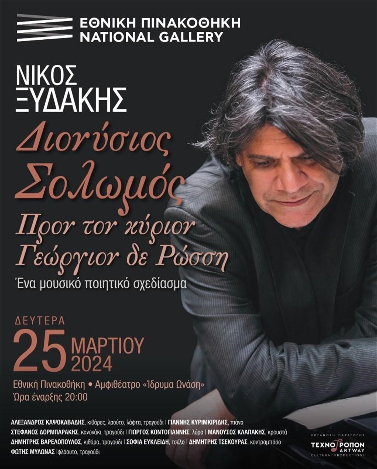 Γ. Σπανός Στις 25 Μαρτίου η Εθνική Πινακοθήκη φιλοξενεί τον Νίκο Ξυδάκη, ο οποίος θα παρουσιάσει την παράσταση με τίτλο Διονύσιος Σολωμός «“Πρός τόν Κύριο Γεώργιο Δέ Ρώσση”», ένα μουσικό ποιητικό σχεδίασμα, σε σύνθεση και ερμηνεία του ίδιου του καλλιτέχνη με τη συνοδεία εννιαμελούς ορχήστρας.