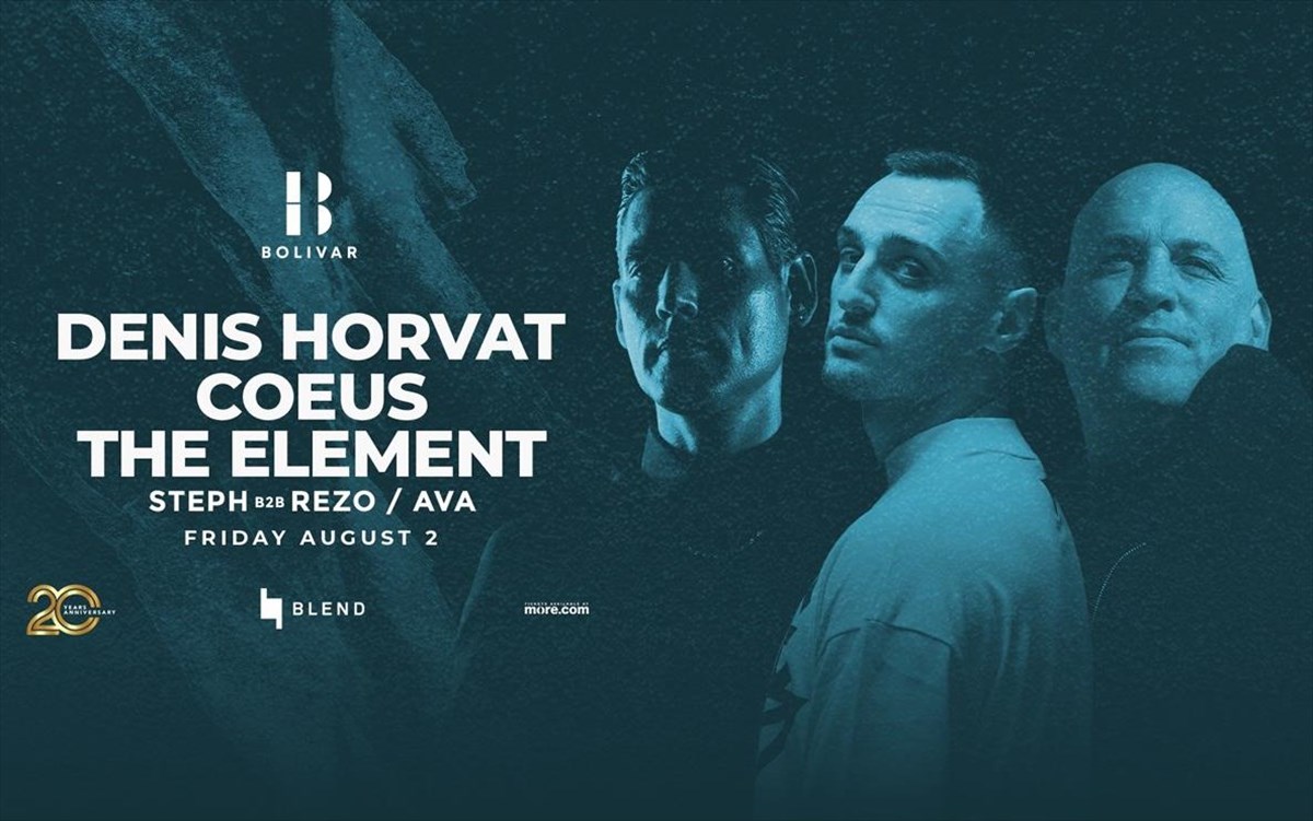 Την Παρασκευή 2 Αυγούστου, το Bolivar Beach Club παρουσιάζει τους τρεις χαρισματικούς και ιδιαίτερα δημοφιλείς καλλιτέχνες Denis Horvat, Coeus και The Element.