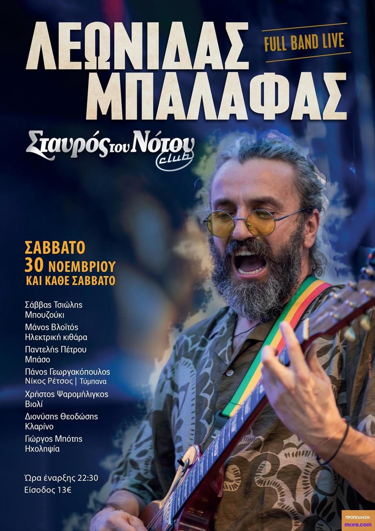 Η ξεχωριστή φωνή του και η ιδιαίτερη σκηνική παρουσία του θα αναδείξουν ξανά τη μοναδικότητα της καλλιτεχνικής του ταυτότητας, σε έναν από τους πιο εμβληματικούς χώρους της Αθήνας, τον Σταυρό του Νότου. Ο Λεωνίδας Μπαλάφας από τις 30 Νοεμβρίου μας υπόσχεται μοναδικές στιγμές με αγαπημένα τραγούδια, νέα και παλιά.