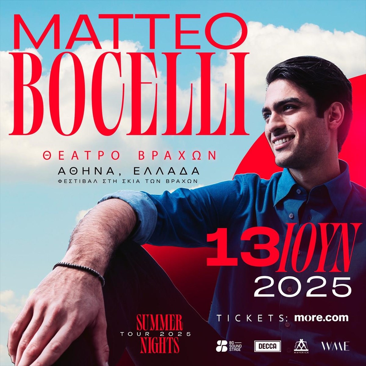 Χαρισματικός καλλιτέχνης με τη δική του μουσική πορεία, ο Matteo Bocelli, στο πλαίσιο της μεγάλης ευρωπαϊκής του περιοδεία, πραγματοποιεί μια συναυλία στην Αθήνα, στις 13/06/2025 στο Θέατρο Βράχων Μελίνα Μερκούρη.