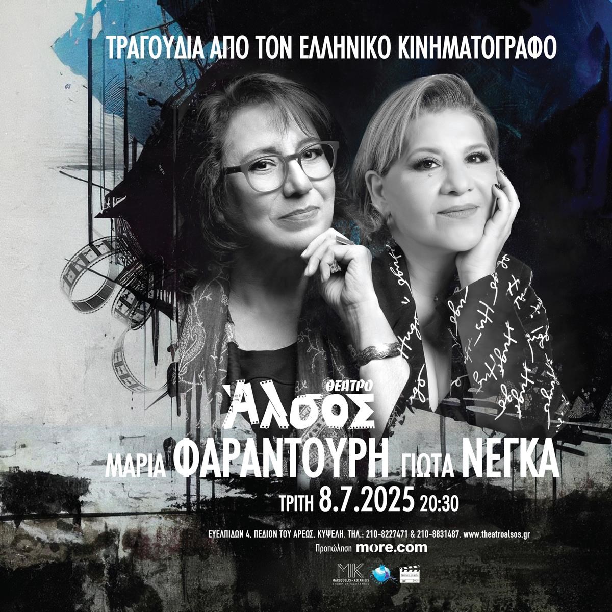 Μετά από την ενθουσιώδη υποδοχή του κοινού και τις δυο sold out παραστάσεις στο ΠΑΛΛΑΣ, η Μαρία Φαραντούρη και η Γιώτα Νέγκα έρχονται την Τρίτη 8 Ιουλίου, στο Θέατρο Άλσος και μας προσκαλούν να ακούσουμε ξανά και να θυμηθούμε Τραγούδια από τον Ελληνικό Κινηματογράφο.