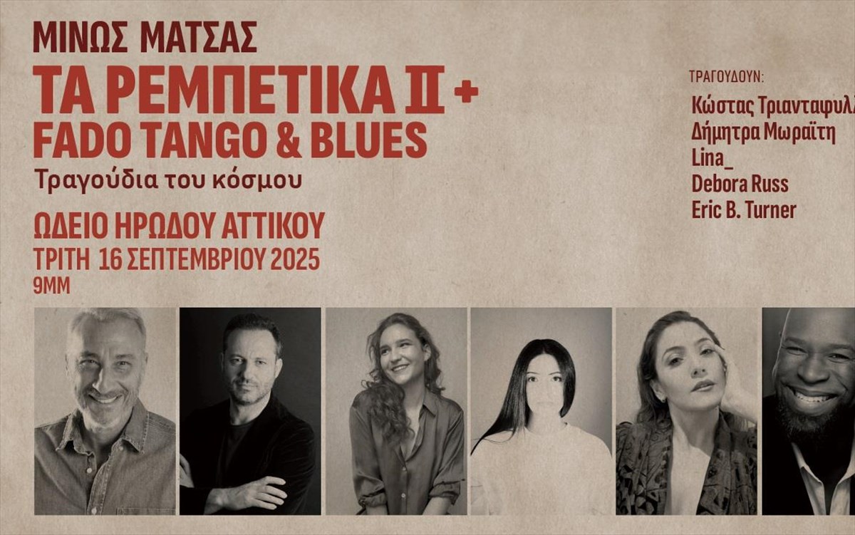 O Μίνως Μάτσας, σε συνέχεια του περσινού sold out, παρουσιάζει την Τρίτη 16 Σεπτεμβρίου 2025 στο Ωδείο Ηρώδου Αττικού τον δεύτερο κύκλο: Τα Ρεμπέτικα II+ Fado Tango & Blues, Τα τραγούδια του κόσμου.