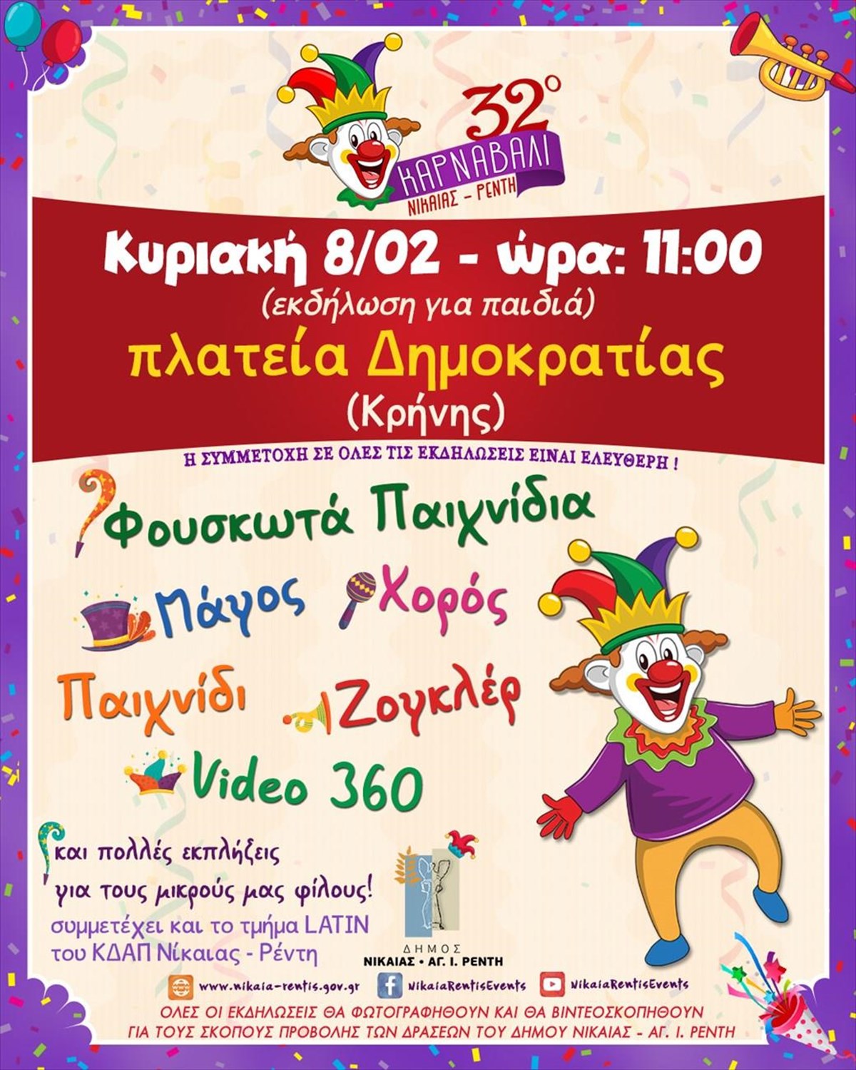Ο Δήμος Νίκαιας –Αγίου Ιωάννη Ρέντη προσκαλεί μικρούς και μεγάλους να ζήσουν δύο μέρες γεμάτες γέλιο, παιχνίδι και μαγεία, στο πλαίσιο του 32ου Καρναβαλιού, μετατρέποντας τις πλατείες σε χώρους διασκέδασης και δημιουργίας.