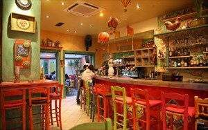 Μέσα σε ένα πολύχρωμο ξύλινο ντεκόρ, με ένα υπέροχο αίθριο στο βάθος και μικρά τσίγκινα χρωματιστά τραπεζάκια καφενείου, μπορείς να έρθεις από το πρωί μέχρι αργά το βράδυ, για διάβασμα, χαλάρωση, συζήτηση ή χορό και διασκέδαση.