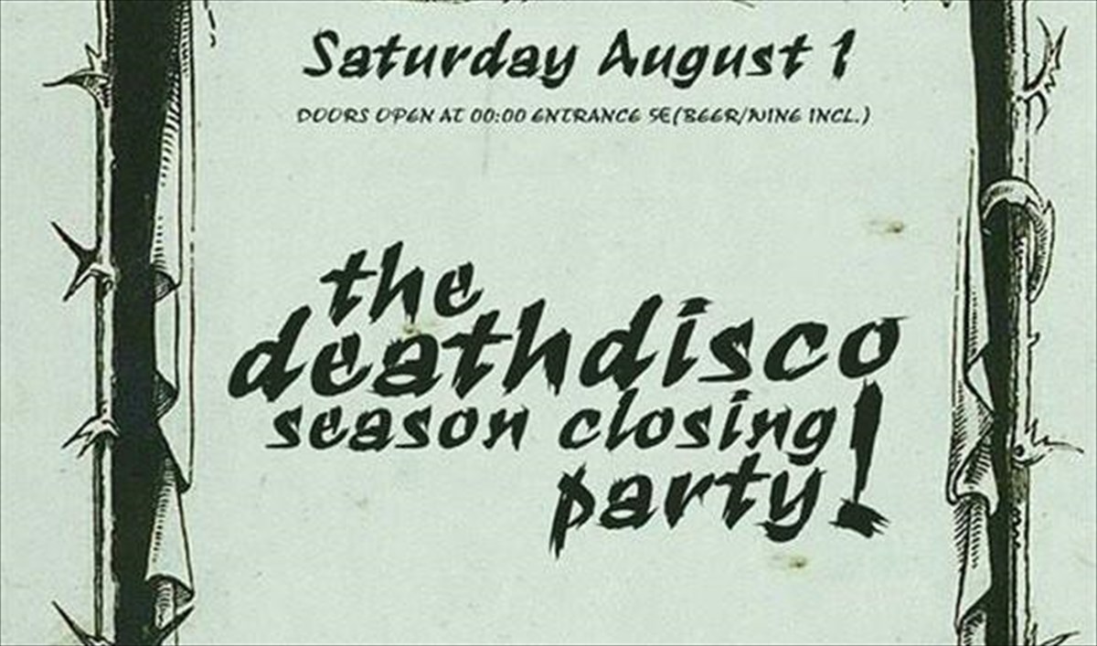 Το Σάββατο 1η Αυγούστου το Death Disco μάς αποχαιρετά με ένα πάρτι από επιλογές dark wave, ebm, 80's, gothic και indie τραγουδιών από τα 80's μέχρι και σήμερα. Οι residents των Death Disco Society πάρτι Λεωνίδας Σκιαδάς και Jeremy θα πλαισιώνονται από εκλεκτούς guests DJ 's, και όλοι μαζί υπόσχονται πως αυτό το πάρτι θα μας δημιουργήσει τις καλύτερες αναμνήσεις μέχρι να ξανασυναντηθούμε, σε λίγες εβδομάδες πάλι, μέσα στους γκρίζους, αλλά πάντα γεμάτους ζωή, τοίχους του Death Disco!