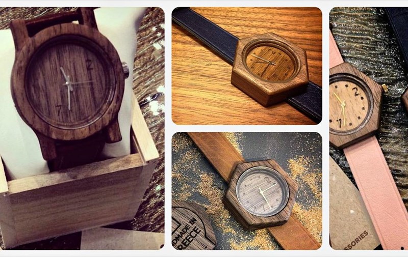 Κατασκευάζουμε ξύλινα παπιγιόν, ξύλινα γυαλιά, ξύλινα μανικετόκουμπα, ξύλινες γραβατοπιάστρες, ξύλινα βραχιόλια και το τελευταίο δημιούργημά μας είναι το ξύλινο ρολόι, το οποίο είναι το μοναδικό που κατασκευάζεται εξ ολοκλήρου στην Ελλάδα.