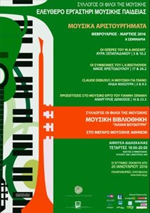 Ελεύθερη εργαστήρι με οχτώ σεμινάρια μουσικής παιδείας από το σύλλογο Οι φίλοι της Μουσικής/Μουσική Βιβλιοθήκη «Λίλιαν Βουδούρη» τον Φεβρουάριο και τον Μάρτιο 2016.