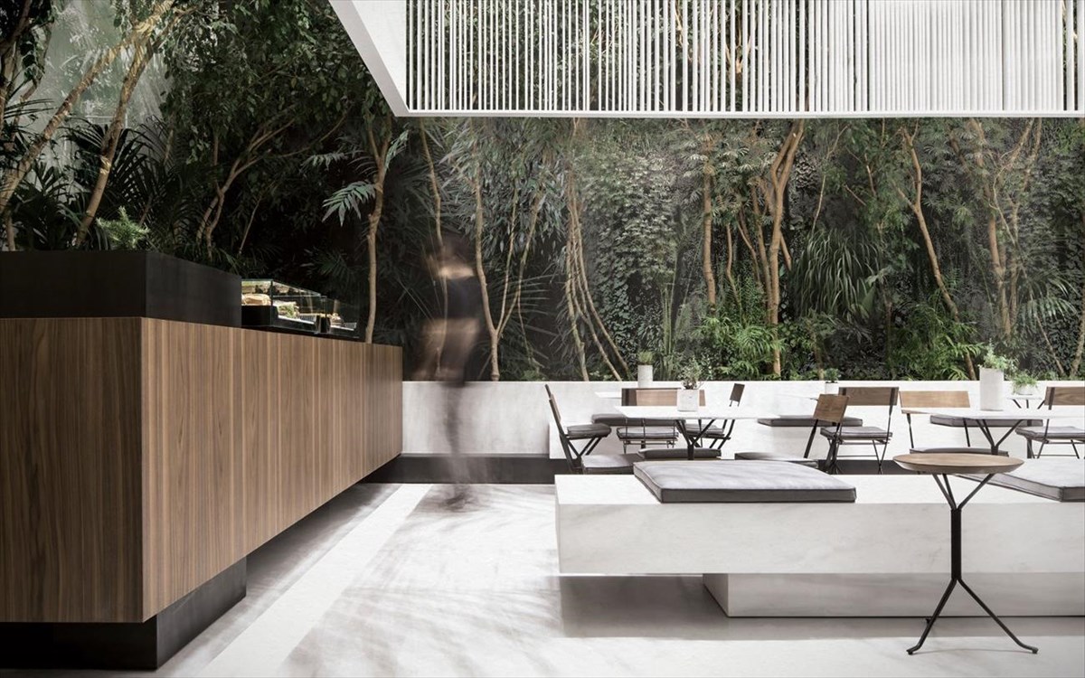 Κατά την είσοδο στο Café, φως και βλάστηση ξαφνιάζουν απρόσμενα το βλέμμα προσφέροντας την αίσθηση ενός κήπου μέσα στην πόλη. Το υποβλητικό αέρινο στέγαστρο-γλυπτό του Στέλιου Κόη, σήμα κατατεθέν του νέου Cycladic Café, δημιουργεί διακριτικές φωτοσκιάσεις ενώ το φυσικό φως που διαχέεται στο χώρο συμπληρώνει φωτισμός με την υπογραφή της Ελευθερίας Ντεκώ. Κύρια χαρακτηριστικά του χώρου είναι η λιτότητα, η αφαίρεση, το μέτρο και η αρμονία. Παράλληλοι μαρμάρινοι πάγκοι συνδυάζονται με φυτά που φτάνουν μέχρι την οροφή του αιθρίου.