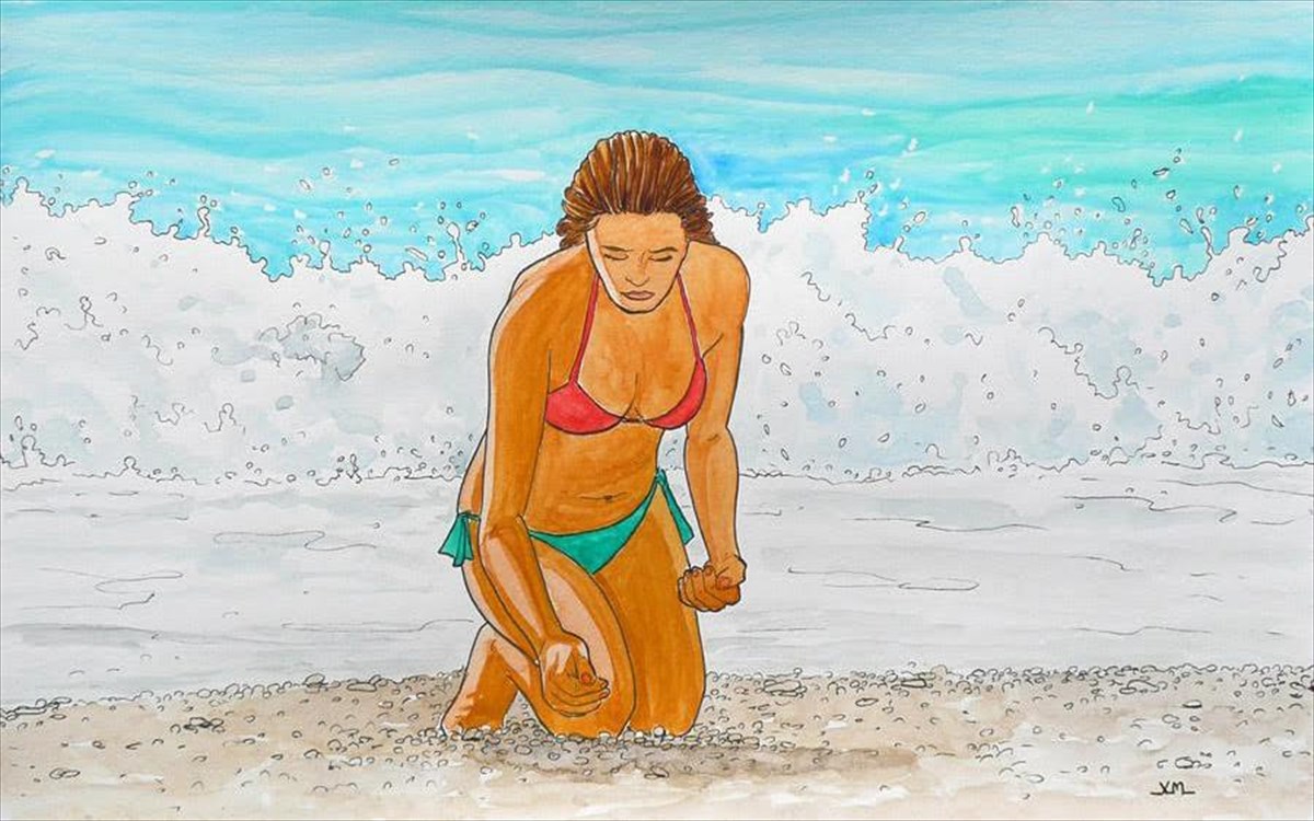 Πάντα βρίσκω έμπνευση στα νησιά και τη θάλασσα και ειδικά στις Κυκλάδες. Και συνήθως τα καλοκαίρια επιστρέφω σπίτι από διακοπές, εφοδιασμένος με όμορφες εικόνες που θα γίνουν η βάση για ζωγραφικά έργα, εικονογραφήσεις ή απλά σκίτσα με μολύβι. Πλούσια η θεματολογία - όμορφες παραλίες και χωριά, η ιδιαίτερη αρχιτεκτονική του Αιγαίου, τα εκκλησάκια, ο κόσμος που συρρέει στη θάλασσα. Οι ανέμελες μικρές στιγμές στις παραλίες, είναι από τα αγαπημένα μου θέματα, άνθρωποι που απλά περπατούν στην αμμουδιά, που αράζουν στις ξαπλώστρες, που παίζουν ρακέτες, που απλά μιλούν ή πίνουν τον καφέ τους, που σκύβουν να μαζέψουν βότσαλα. Όπως εδώ. Καλό καλοκαίρι!