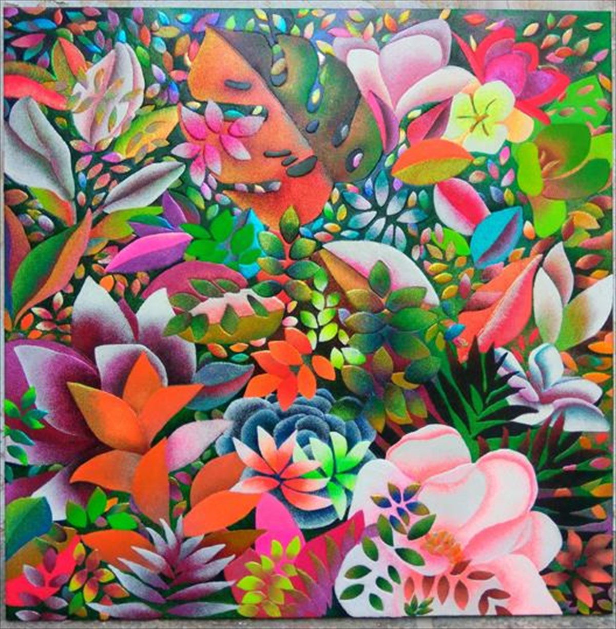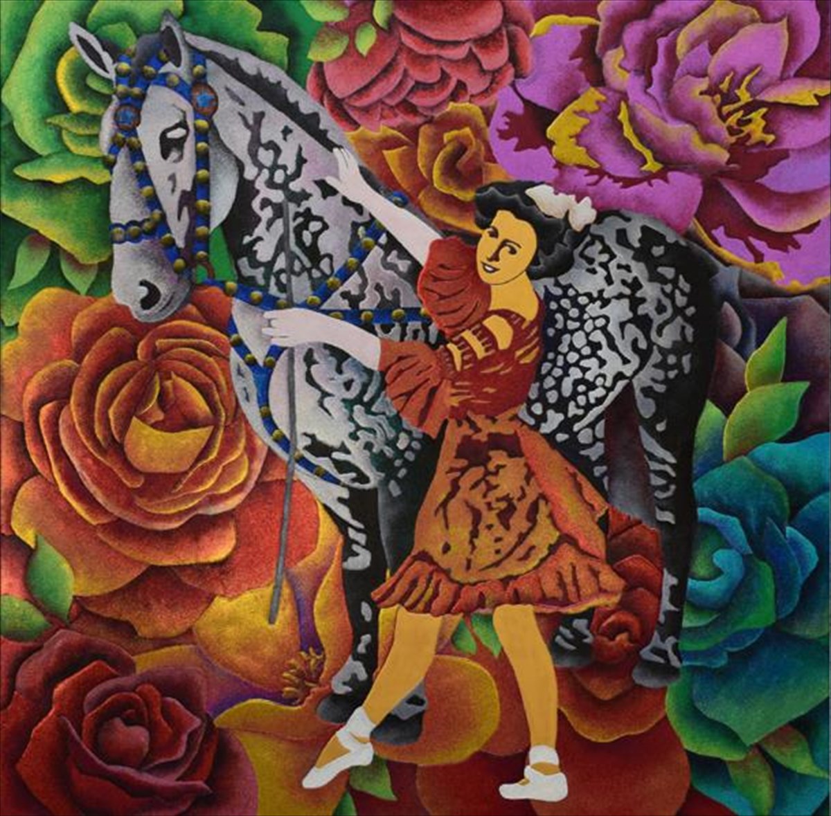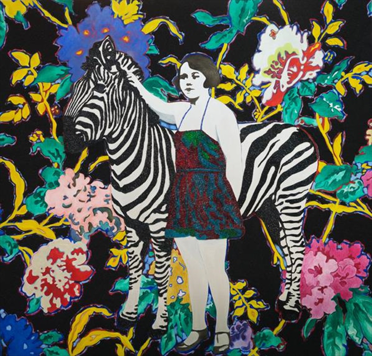 Σε κάποια άλλα έργα της, η εικαστικός εντάσσει στις συνθέσεις της και την ανθρώπινη παρουσία και συγκεκριμένα την γυναικεία. Πλασμένες με τρόπο που παραπέμπει σε ρετρο/ποπ καταβολές, έντονα σχηματοποιημένες και στυλιζαρισμένες, οι γυναικείες φιγούρες βρίσκονται τοποθετημένες σε ολάνθιστους κήπους από πολύχρωμα τριαντάφυλλα και είναι στραμμένες στον θεατή. Κάπου, βρίσκουμε μια γυναίκα ν' αγγίζει τρυφερά μια ζέβρα σε άνθινο τόπο.
