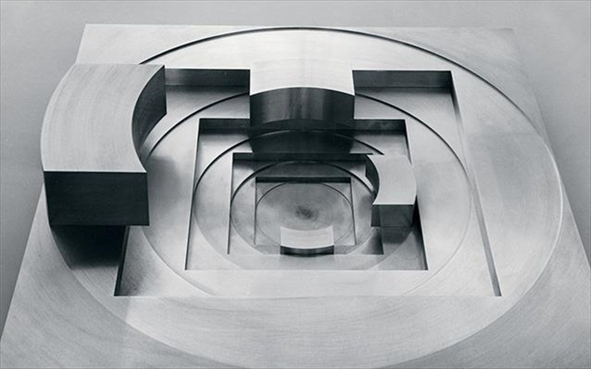 Ikastikos DL: Ioannis Savvidis, Hacking Truth About scapes series, Acropolis Water Reservoir, γραφίτης σε χαρτί Hahnemühle, 22×31,5cm, 2017 Kalfayan: Nαυσικά Πάστρα, Σύνεκτρον-Τετράγωνο-Κύκλος, 1971, duraluminium