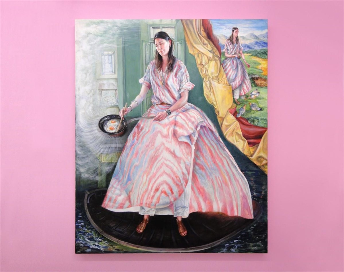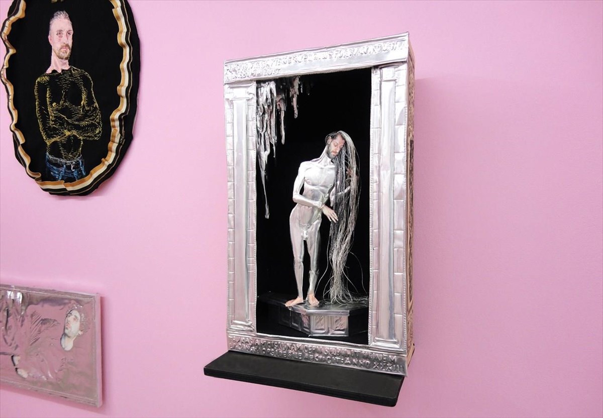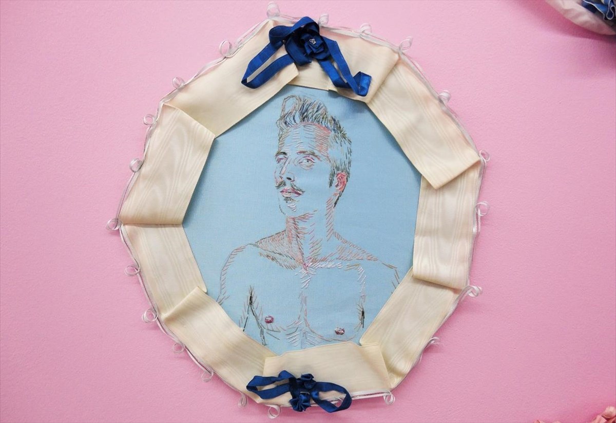 Τοποθετημένα σε ένα δωμάτιο βαμμένο ροζ ώστε να θυμίζει μπουντουάρ ο καλλιτέχνης παρουσιάζει ζωγραφικούς πίνακες με την χαρακτηριστική τεχνική της αυγοτέμπερας σε ξύλο, επιτοίχια έργα και κατασκευές με ζωγραφική και ανάγλυφα στοιχεία σε αλουμίνιο, και μία σειρά από έργα με κορδέλες και υφάσματα κεντημένα στο χέρι.