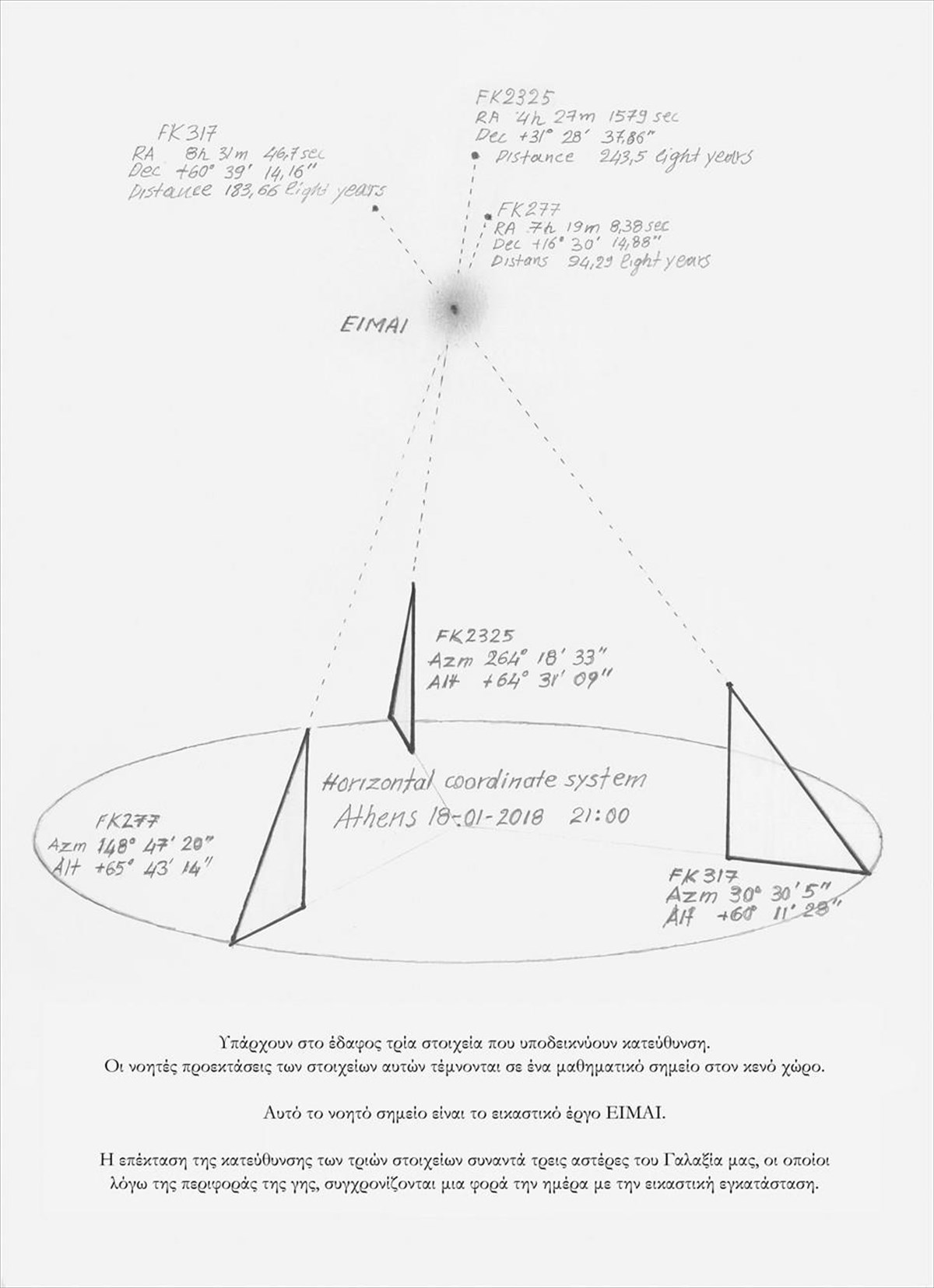 Δημήτρης Τράγκας, ΕΙΜΑΙ, 2018, Εγκατάσταση, Ξύλο, μέταλλο, κιμωλία, κείμενο, Διάμετρος 300 εκ., Σχεδιάγραμμα εγκατάστασης