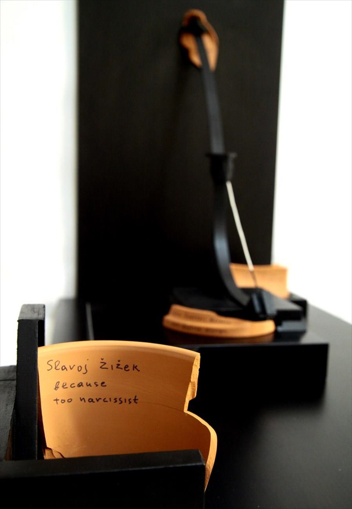 Γιώργος Παπαδάτος, Σημειώσεις για ένα μεταβατικό μνημείο, 2012-2017 (εν εξελίξει), Εγκατάσταση, Ξύλο, φωτογραφικές εκτυπώσεις, σχέδια, πήλινα θραύσματα, Μεταβλητές διαστάσεις, (άποψη εγκατάστασης)