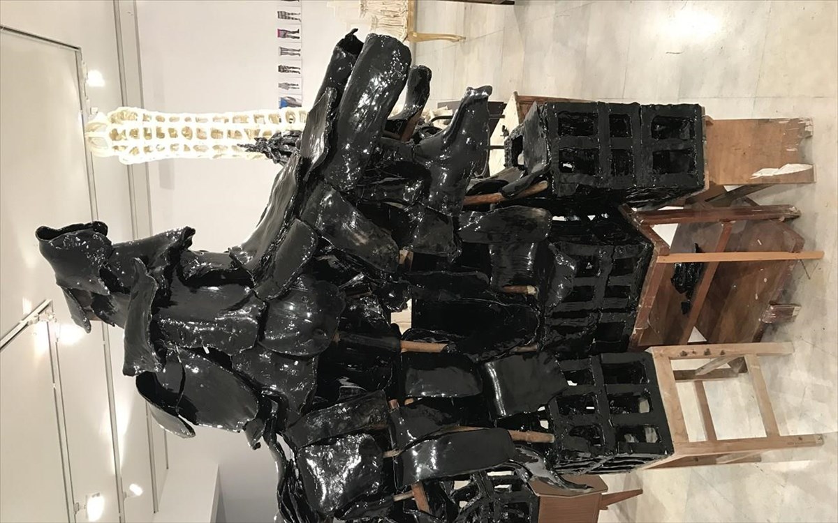 Νίκος Τρανός Χωρίς τίτλο από τη σειρά «White Power», 2007-2017 Εγκατάσταση, Οικιακά έπιπλα, πηλός ψημένος και υαλωμένος δύο φορές στους 1050 βαθμούς Κελσίου, 280 x 170 x 170 εκ. (άποψη εγκατάστασης)