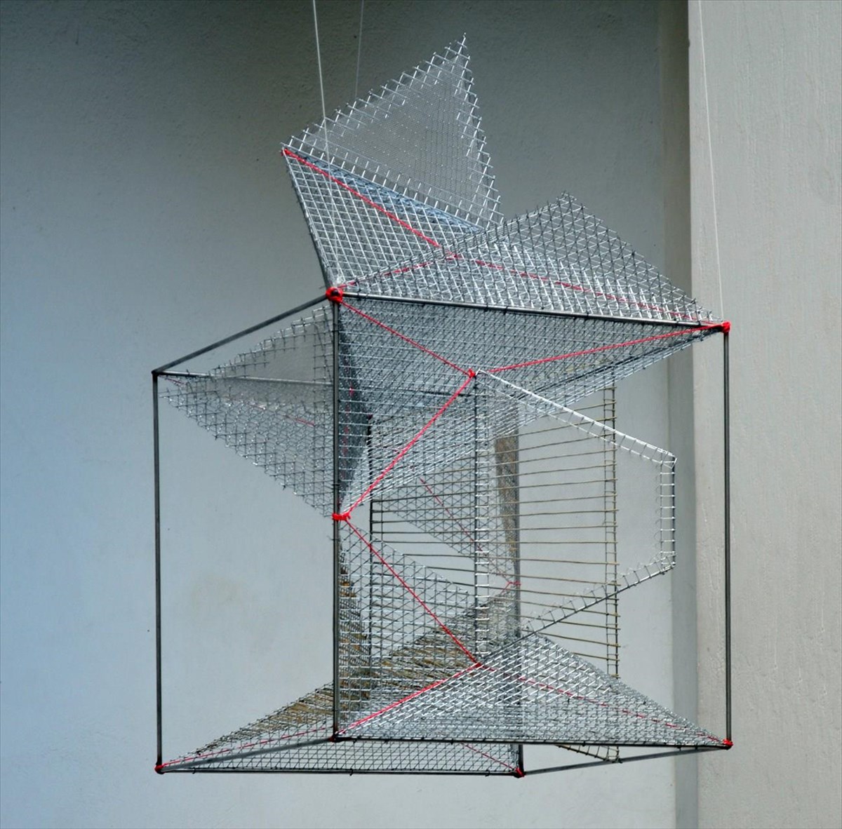 Έρση Χατζηαργυρού, Καινές τομές μνήμης, 2017-2018, Πλέγμα, σίτες, σίδερο, μπρούτζος, χόρτα, πέτρες και χώματα Λαυρίου, μηχανισμός, Βάση 180 x 180 εκ., αιωρούμενος κύβος 70 x 70 x 70 εκ., (λεπτομέρεια)