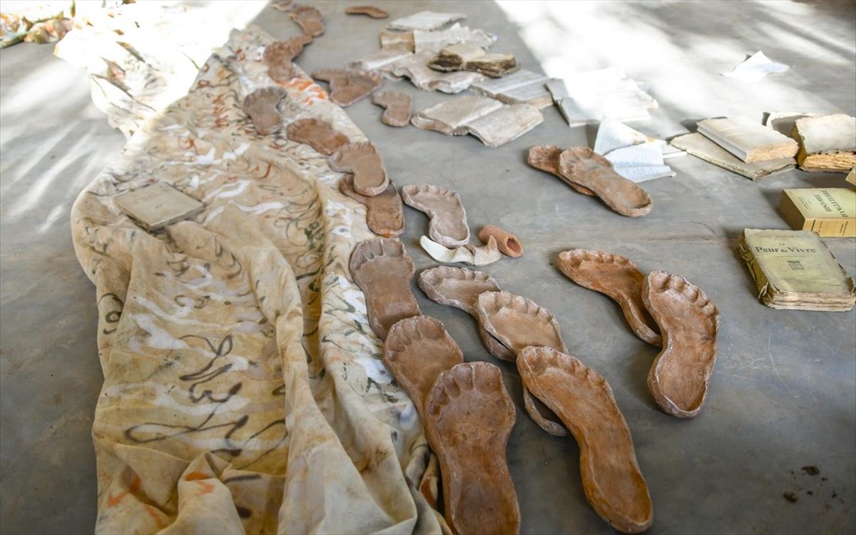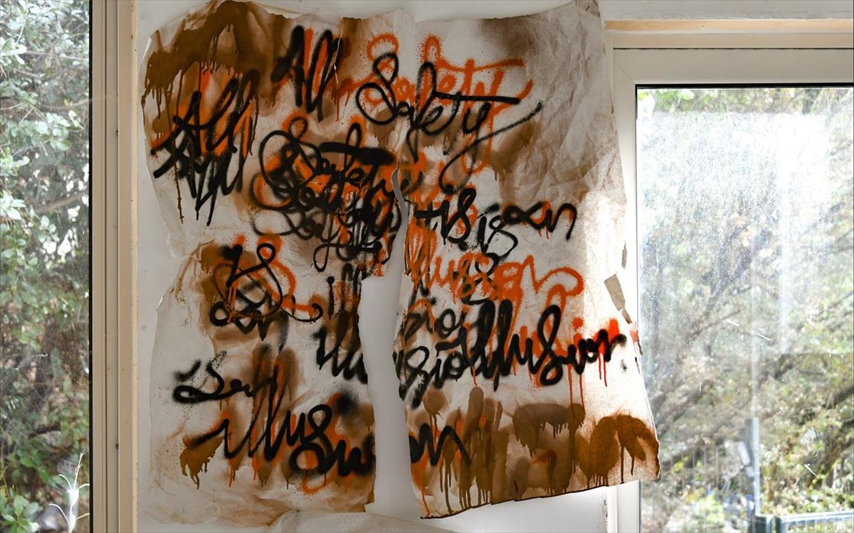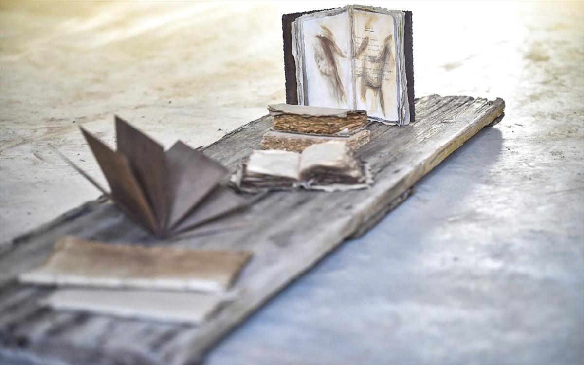 Βιβλία απλωμένα σε ένα μεγάλο τραπέζι κι άλλα κρεμασμένα στον τοίχο, πλάι σε μεγάλα μεταλλικά κηροπήγια με τη φλόγα των κεριών τους άλλοτε να τρεμοπαίζει κι άλλοτε να είναι σβηστή. Τρία καράβια από κυματοδαρμένα ξύλα και φαγωμένα από τον άνεμο μέταλλα «πλέουν» σε μια θάλασσα από πήλινα βήματα. Και πλάι τους ένας σιωπηλός καταρράκτης πηγάζει από τον τοίχο αφήνοντας να πέσουν στο δάπεδο δεκάδες γκραφίτι.