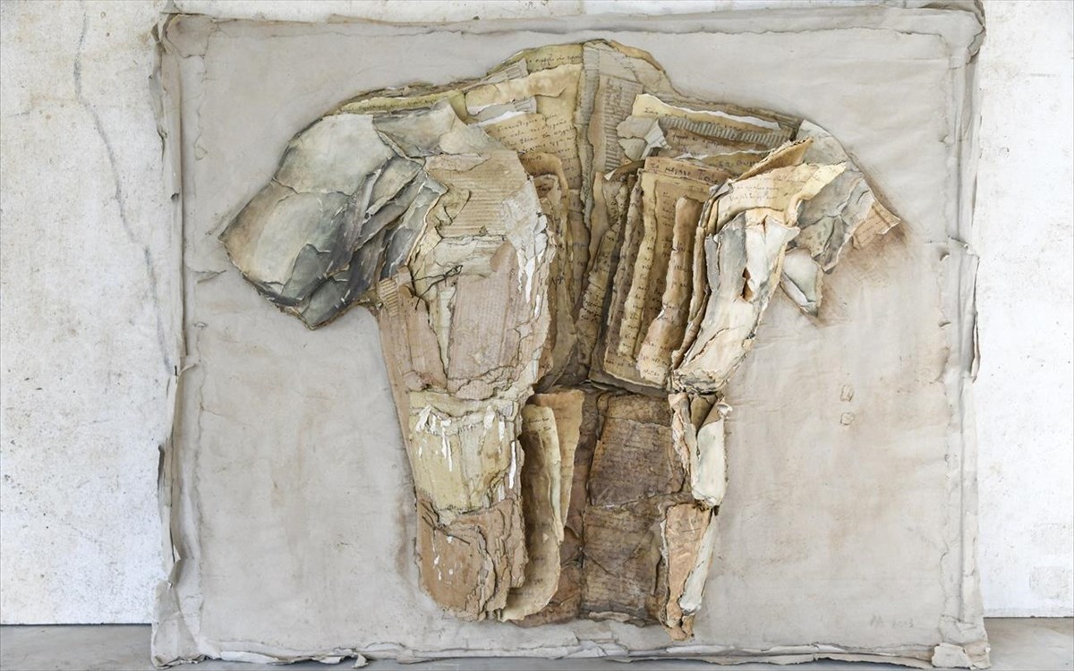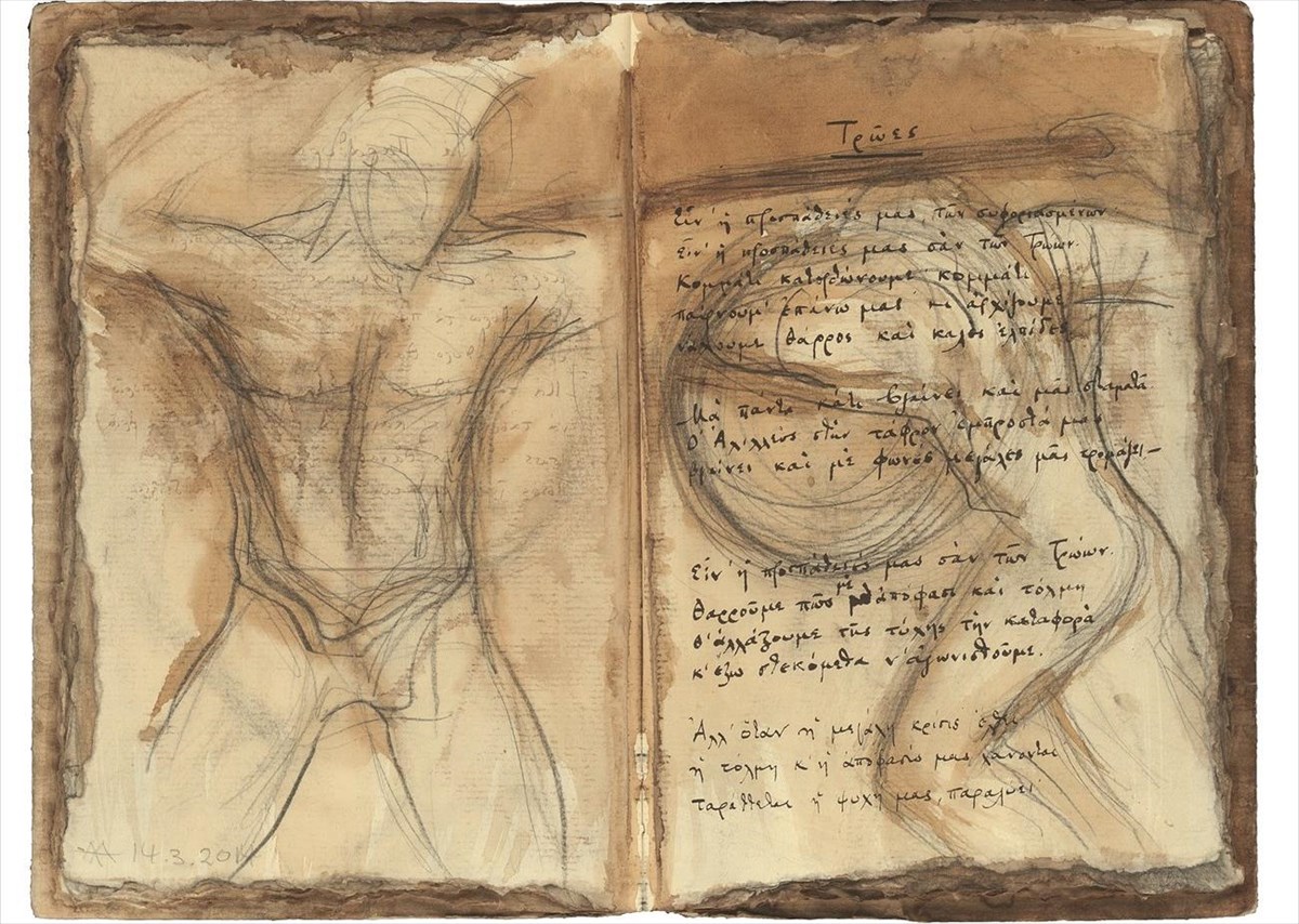 «Ο γραφικός χαρακτήρας του Καβάφη, αλλά και το ίχνος που αφήνει η γραφή στην πίσω πλευρά κάθε σελίδας με ενδιαφέρουν πολύ. Γι’ αυτό και επέλεξα 18 αντίτυπα από την συγκεκριμένη έκδοση, παλαίωσα τις σελίδες της με τσάι και καφέ, με μολύβι ή ακόμη και σκίζοντας τις άκρες κι άρχισα να δημιουργώ τα δικά μου βιβλία, άλλοτε πιο κλειστά, άλλοτε περισσότερο ανοιχτά ώστε τα αποσπάσματά τους να μην διαβάζονται πάντα εύκολα, όπως ακριβώς συμβαίνει και με τον εαυτό μας: αποκαλύπτουμε ένα μέρος του κι ένα άλλο το κρατάμε κρυφό», λέει η Αλεξάνδρα Αθανασιάδη για το νέο σύνολο έργων της, το οποίο ξεκίνησε από έναν ανάγλυφο κορμό χτισμένο από μεγεθυσμένα και ταλαιπωρημένα θραύσματα χειρόγραφων ποιημάτων που δημιούργησε το 2013 για μια έκθεση στους Δελφούς με αφορμή τα 150 χρόνια από τη γέννηση του Κ.Π. Καβάφη και 80 από το θάνατό του.