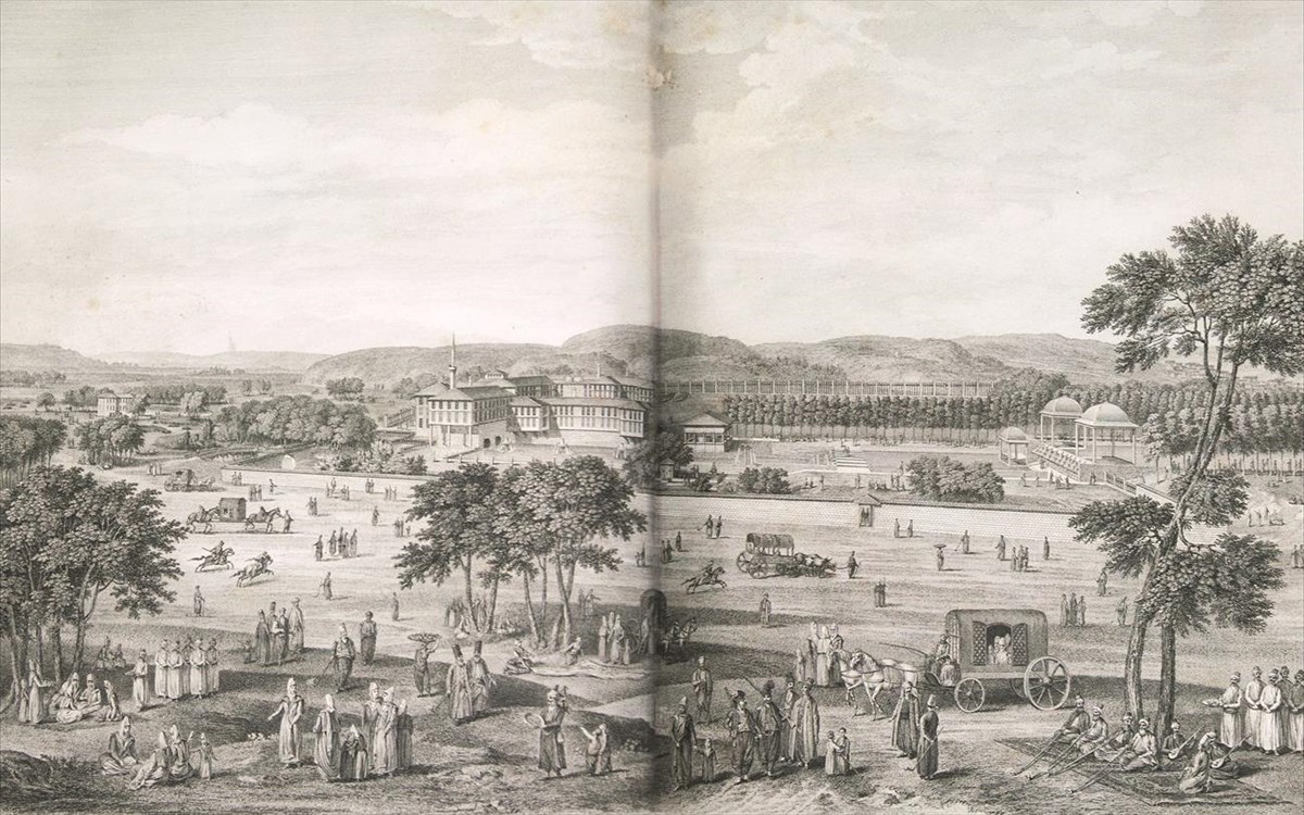 Δημόσιος περίπατος στο Keaghid-Khane (Γλυκά Νερά), στα περίχωρα της Κωνσταντινούπολης. Χαλκογραφία. Ignace Mouradja d’Ohsson, Tableau général de l'Empire Othoman: divisé en deux parties, dont l'une comprend la législation Mahométane, l'autre, l'histoire de & l'Empire Othoman…,Tome second, Del’Imprimerie de Monsieur, Παρίσι 1790. Αντίτυπο πολυτελείας, χωρίς υπομνηματισμό ( “before letters”), το οποίο ανήκε στον βασιλιά της Σουηδίας Charles Bernadotte XV. Μουσείο Μπενάκη – Συλλογή Ευστάθιου Φινόπουλου.